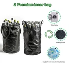 Convenient Recycling No need to use hands to open or close the lid, only one hand is needed to insert the bottle. Large CapacityThe 26 Gallon Size could hold max up to unsqueezed 35 empty plastice bottles.You can also choose the 13-gallon size for under-the-table use. Collapsible DesignIt's super easy to assemble, just insert the 4 white rods into the 4 black long straps comes frome the 4 corners of the bottm. Waterproof & SturdyMade of thickened oxford cloth with special coating, It is strong, wear-resistant. The bamboo handle is rust-resistant and lightweight. Most stains can be cleaned by wiping the surface with a rag without rinsing with water. Reusable Inner BagThe inner bag is made of recycled materials, making it 100% environmentally friendly.It is also machine washable. Fastened to the four corners with horn buckle, you can easily remove it and take it to a recycling site.