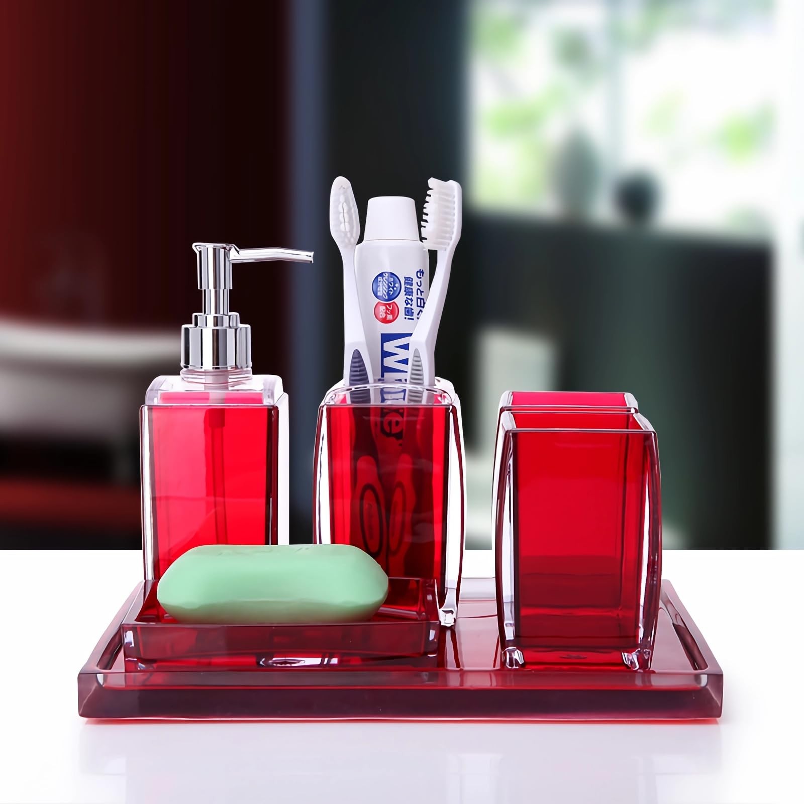 Luxury Premium Craftsmanship Our bathroom accessory set is made of a top-grade acrylic material, which is stronger and more durable than glass and ceramic, that inhibits water damage, leaks. A breeze to polish, just wipe its surface using a clean damp cloth. We masterfully created each of our products with user satisfaction and durability in mind, so you can purchase in confidence. 【High-Quality Acrylic Material】: bathroom accessory set uses high-quality acrylic to provide glass-like clarity and greater durability. Stylish, functional , durable ,easy to clean. which has a very high transmittance.It eliminates any sense of cheap plastic 【Elegant Design】:Unique, visually-appealing design complements any bathroom decor. The toothbrush holder and soap dispenser set for modern, farmhouse and boho styles, also suitable for bathroom, kitchen, bedroom decor, etc 【Easy to Clean】: bathroom accessories set has a smooth surface and is easy to clean.Simply wipe away any stains or smudges for a pristine and hygienic appearance every time. 【Fully function Completed Set】:Bathroom Accessory Set Complete Include toothbrush holder, toothbrush cup, lotion dispenser, soap dish, which equips everything you will need to organize your toiletries. 【Perfect gfit set 】: bathroom soap dispenser set is the perfect gift for your friend, family, business partner or anyone who wants to equip their bathroom with a set of practical accessories. suitable for modern, country, farmhouse and many other styles, also suitable for bedroom, bathroom, Spa,kitchen,home decorations and so on.