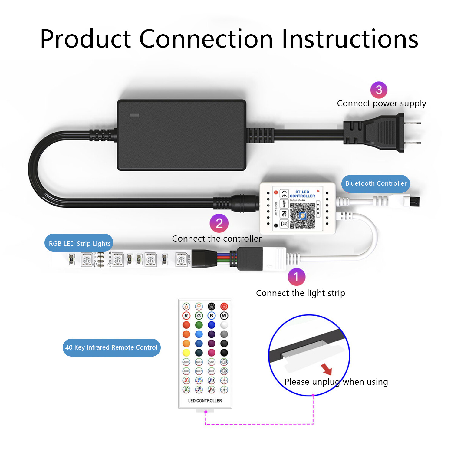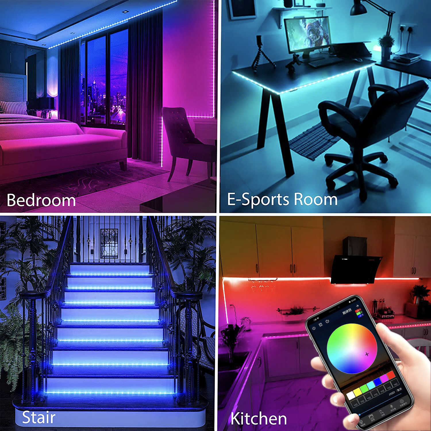 Description: Music Sync Mode: Let your LED light strips dance to the beat in real-time.Perfect for birthday parties, Christmas, Easter, Halloween, carnival, prom, wedding or everyday use because these RGB LED light bars can bring you a visual feast. Remote Control:These LED strips are very easy to control via remote control, and 16 million colors with a large number of interesting modes can enhance the beauty of your room decor aesthetic. Long Lighting: These RGB LED strip lights for bedroom are long enough to decorate and colorize larger areas giving you more coverage and more design options. Suitable for bedrooms, kitchens, stairs, dining rooms, ceilings. Easy Installation: It's easy to install and you can install the RGB LED strip lights to any dry, clean surface. Multiple Scene Options: The light strip has 64 scene modes to create a festive atmosphere that matches your mood or activity. Waterproof: LED ligh strip is silicone outside to make it waterproof, multiple use everywhere, can be as TV back lights, bedroom led strip lights, outdoor garden lights, porch lights, cloth lights for and holiday used. Application: 1.Ideal for decoration of building outlines, landscape illumination, amusement themes, Indoor decorations,Party decoration 2.And TV Backlight, car, living room, bedroom, Party, KTV, storefronts, bar, nightclub, street, sidewalk, deck, park, porch, staircase, railing, ceiling, or driveway. Specifications: Length: 50ft, 32ft, 16.4ft LED type: RGB 5050 Input voltage: 12V Power consumption: 24W Light color: red, green, blue, multi-color Average life: 50,000 hours Package includes: 1 x RGB LED strip light 1 x 24 keys Remote Control 1 x Power supply 12V 1 x User manual