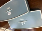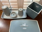 6 Piece Restoration Hardware Bath Vanity Set. The set includes a lidded jar for storing small items, tissue box cover, cup and a set of trays for displaying on your vanity top. Gorgeous clean lines and gentle edges. Two Trays: Both are 13”x6.75” Tissue Box cover is 5.75x5.75x5.50” Jar with Lid is approx 5”H Cup is 3.75”H