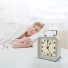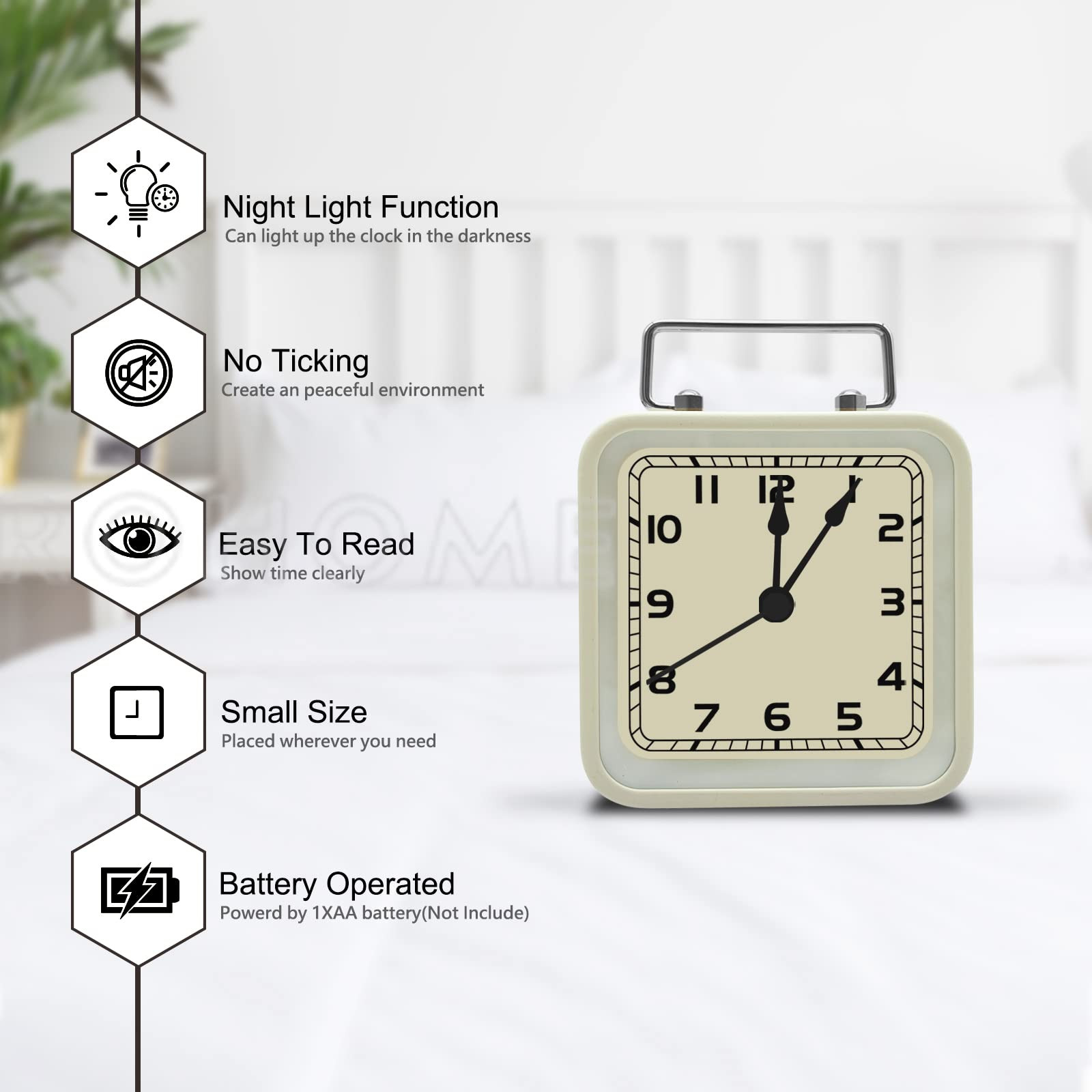 This is a retro desktop alarm clock with HD glass. It looks very cute and stylish. No matter from any angle, you can clearly see the numbers on the dial and know the current time in time. It's concise, clear, and easy to understand. High-end piano lacquered frame with top handle, perfect for placing on a bedside table or hanging as a decoration in a children's room. Tickless, quiet and smooth quartz movement and second hand ensure a good sleep and the best working environment. Suitable for travel, bookshelf, living room, office, kitchen and counter. When you hear the alarm clock, press the night light symbol on the back, the alarm sound will stop, and it will sound again after 5 minutes. The alarm's snooze function continues and loops until you simply turn off the alarm on the back. This clock is powered by only 1 AA (not included). The wireless design allows it to be placed anywhere you need it. You can light up the clock in the dark and see the time. The little yellow light does not irritate the eyes. While protecting the eyes, it also brings a warm and comfortable feeling to the room.