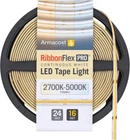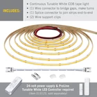 Continuous COB white tape light featuring a high CRI (90) and tunable color temperature control Flexible LED tape light can be cut to size or cut and reconnected for custom installs Energy efficient CCT COB LED strips use 24V low voltage power LED strip lights dimmable 0 to 100% brightness Must be paired with the Proline CCT Tunable White LED Controller (sold separately) for remote lighting control Armacost Lighting's RibbonFlex Pro 24 Volt Tunable White Continuous LED Strip Light features both COB LED and CCT technology, making it the most adjustable and customizable accent lighting solution available. Dotless COB LED strip lights emit a continuous strip of illumination that is free of spots or breaks. CCT tunable technology provides shades of white light from a warm 2700K to a cool 5000K. With a seamless light output, this unique LED light tape is especially perfect for under cabinet lighting as it prevents visible LED dot reflections on countertops. Flexible LED strip light can be used as-is or cut to size for custom installations. 24V power supply and Armacost Lighting ProLine Tunable White LED Controller required and sold separately.