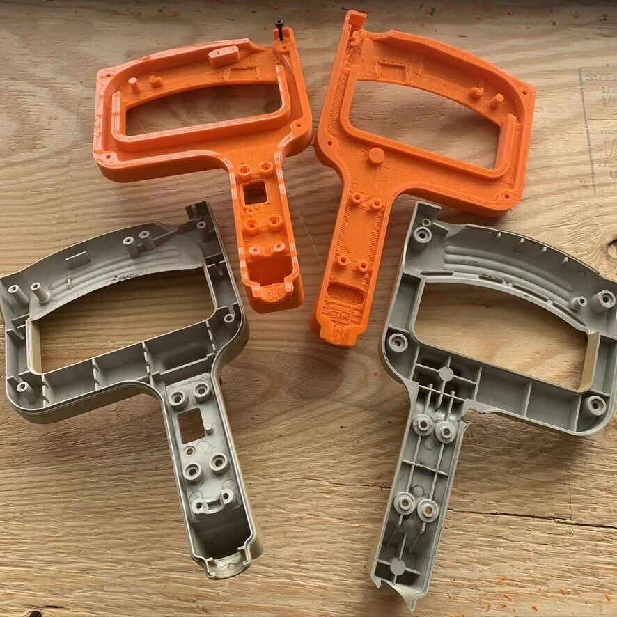 Ridgid Miter Saw Handle Upper and Lower for MS1250 and MS1250LZ 828056 (lower) and 828062 (upper) This is a 3d redesigned and 3d printed solution for broken Ridgid Miter Saw Handle Upper and Lower for MS1250LZ1 - 828056 (lower) and 828062 (upper). The only difference is that the handle has been redesigned internally to be exceptionally stronger than the original handle that was prone to breaking and cracking under minor stress. Note this only the plastic handle housing and does not include any of the other internal components such as the switch or springs. These handles use an M4 nut and bolt to secure the two halves together and you will need a metric Allen / Hex bit to assemble. 3d printing is an additive manufacturing technology that in this case uses PETG filament (stronger and higher degree of durability and resistance to outside conditions) but instead of injection molding, 3d printing offers a stronger internal structure since this handle specifically is made up of over 500 layers of alternating infilled patterns made of honeycomb shape. I am usually able to ship same day, but I have a few days for handling on here in case I run a little behind and have to print more. Please note that as this is 3d printed these handles take about 18hrs to print and I do my best to clean support material and minor defects so please be patient with me if I miss any defects and I'll do my best to help you with any issues if they arise. So far over 200 happy customers with new 3d printed handles on their miter saws! Here's a link to a YouTube video where the switch is replaced and essentially the handle and internals on a similar model: https://www.youtube.com/watch?v=f4OLmpzj3Zw Happy woodworking!