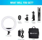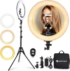 Ring Light 18 Inch LED Ringlight Kit with 73 inch Tripod Stand with Phone 【INTELLIGENT AND QUICK COLOR CHANGE】: Yesker Ring Lights are controlled via the knob on the stand. Adjust the color temperature from 3200K to 6000K easily without using color filters and ring light have a wide brightness dimming range from 10%-100%. Achieve cold white light or warm light to hide blemishes and change skin tones quickly and easily.12 heat dissipating hole can cool your ring light,which will extend the life of the product. 【STURDY SUPPORT STAND】: Adjustable height ranges from 31.5 inches to 73 inches; Equipped with 1/4 inch screw thread on the top; Made of aluminum alloy; Pretty stable 3-leg stage design and solid locking system keeps all your stuff in safe without any wobble when in use.The retractable folded tripod can effortlessly adjust to the height you want, when you use them please put the three legs down. 【360° ROTABLE PHONE HOLDER】: A hot shoe adapter for most DSLR camera, a adjustable phone holder (max can reach to 4.13") for most smartphones, you can rotate your phone into vertical mode or horizontal mode freely without taking the phone out of the holder. Best for Selfie video recording, camera photography shooting, makeup live streaming. It can be used for DSLR camera/Smartphone/Mirrorless camera/Mirror. With wireless remote control, set your hands free for photo shooting. 【WIDE COMPATIBILITY】: 112pcs Osram 2835 LED beads on our Ring Light eliminates stark shadows, widely applied to lighting, fashion, wedding art, advertisement photography, makeup, videos, studio shoot, portrait photography, live streamingamd selfies etc. 【PACKAGE INCLUDES】:Inside of your package, you will receive: LED Ring Light Body (18 in / 46cm) x1, Tripod (20-75 in / 50-190 cm) x1, Wireless Remoter x1, Phone Holder x1, Hot shoe adapter x1, Power Adapter x1, Durable Carry Bag x1 and Instruction manual x1 ------------------------------------------------------------------------------------------ Shipping Policy: Domestic lower 48 states shipping is free and expedited. Shipping is also free to the rest US states and US Protectorates including Puerto Rico, Alaska, Hawaii, APO/FPO, but delivery times are longer than usual. If you need your order by a specific date please contact us before you make the purchase for a delivery estimate. ------------------------------------------------------------------------------------------ Return Policy: Your satisfaction is guaranteed! If for any reason you are unhappy with your item, just return it within 30 days for a full refund. Please contact us prior to initiating a return so that we can issue you a refund authorization.
