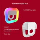 The perfect selfie starts here! Add just the right amount of light to your selfies, videos, and pictures with the ON AIR Mini Mobile Light. This unique mobile ring light features 12 LED lights that emit a bright, soft glow that is perfect for highlighting all your best features. With the press of a button, you can cycle through 18 different light modes that span the full RGB color spectrum until you find the right color that best suits your mood. Clip the light onto your phone, tablet, or laptop – thanks to its easy clip-on design, the ON AIR Mini Mobile Light is compatible with all mobile devices. It is also lightweight and compact for ultra-portability. With this stylish, portable halo light, you can instantly elevate your selfies and photographs to a whole new level. Just clip on, turn on, open your favorite photo app, and let the selfie magic begin! Featuring the full RBG color spectrum, as well as soft yellow and white light. 20-minute auto-shutoff feature for safety and convenience. 18 light modes, including rainbow and mixed running colors – find the right color combination for you with just the click of a button! Ideal for selfies, photography, Zoom calls, and video. Compact, portable, and stylishly designed Quick and easy clip-on installation— compatible with all mobile devices.