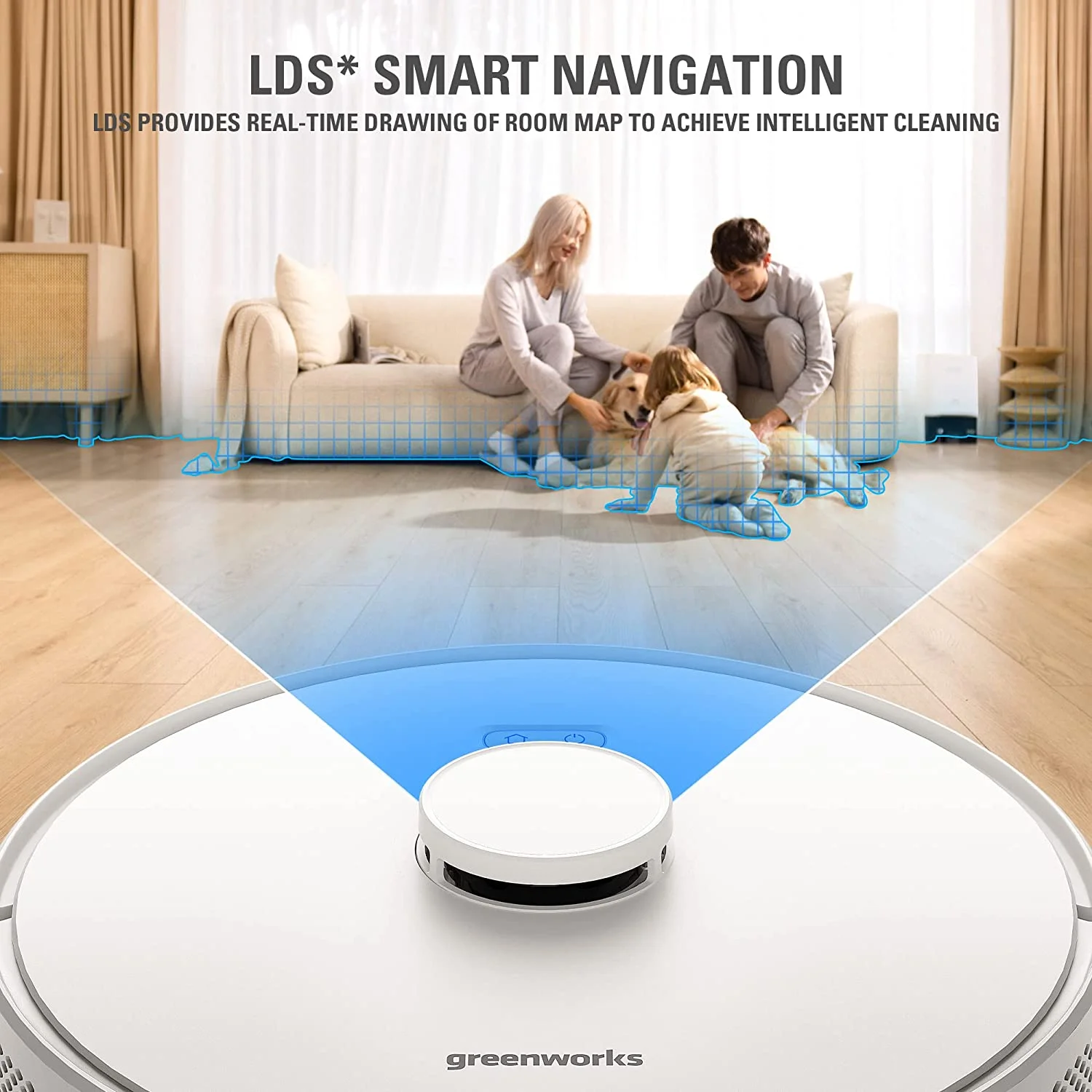 Equipped with LDS laser navigation and vSLAM technology, this Greenworks robotic vacuum maps your home precisely to avoid obstacles and clean efficiently. Its self-emptying base automatically transfers dirt to a 4L dust bag, letting it operate unattended for up to 45 days while charging. Customize cleaning via the SMARTg app—target specific rooms, zones, or use 2000Pa suction power for deep cleans. Voice control via Alexa or Google Assistant adds convenience, making it a hands-free solution for hassle-free home maintenance. 【LDS* Smart Navigation】Greenworks Intelligent LDS Laser Navigation and vSLAM Technology Accurately Maps Your Home to Avoid Obstacles and Efficiently Clean. 【Self-emptying Dirt into The Dust Bag】Auto-Collection Base Charges the Vacuum and Empties the Small Onboard Dust Bin without Attention. 【Automatic Dirt Disposal】Set it and Forget it for up to 45 Days. 4L Auto-Collection Base Will Allow the Vacuum to Clean Unassisted for Long Periods of Time. 【Customize Cleaning Modes and Zones】Choose Specific Rooms, Areas, or Zones to Clean Using Customize Cleaning Modes and Zones in the SmartG App. 【Smart APP & Voice Control】Voice Control and Connectivity: Google Assistant.