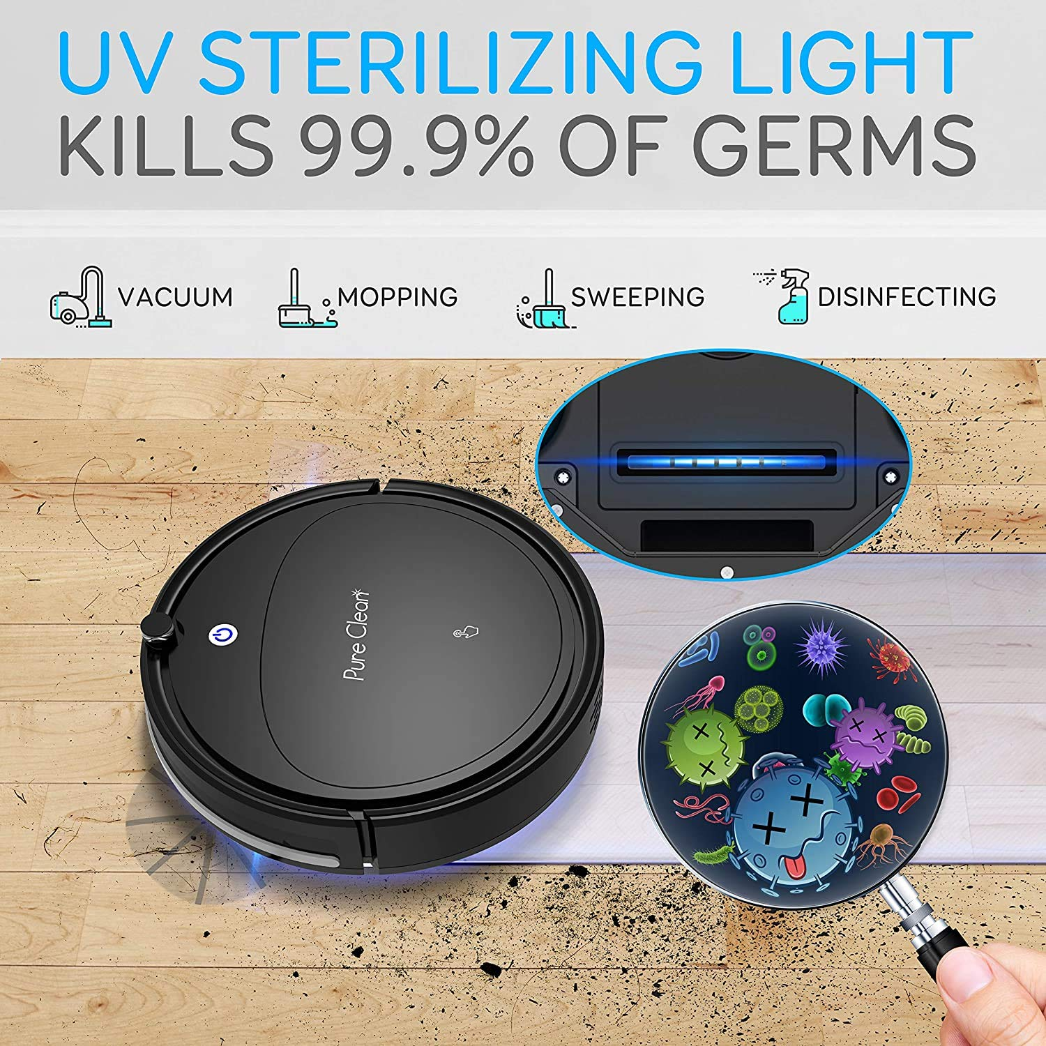 ADJUSTABLE SUCTION POWER: The 1200pa suction power of this vacuum robot pet hair sweeper robot is strong enough to lift up tiny dust w/out compromising battery performance. You can adjust the machine suction power in any working mode.Runtime : 70 minutes Competitors featuring suction only cleaning are no match. This vacuum cleaner robot is pinning side brushes to lift up fine dust particles other robots leave behind OBSTACLE DETECTION: PureClean home robot sweeper self-charging robotic cleaners features obstacle detection & cleans around objects or furniture. Also equipped w/ anti-fall sensors & protective bumper housing to keep robovac from falling off stairs AUTOMATIC RECHARGE DOCK: This robotic vacuum cleaner mop combo will automatically return to the charging station when battery power is low. It also comes with remote control for hassle-free operation 60-70 MIN RUN TIME: The ultra-quiet carpets/tile/hardwood floor robot vacuum slim auto vacuum features a low-profile design to easily slide underneath furniture & has a high capacity 9.6V, 2000mAh LiFePO4 rechargeable battery for 60-70 min run time robot vacuum