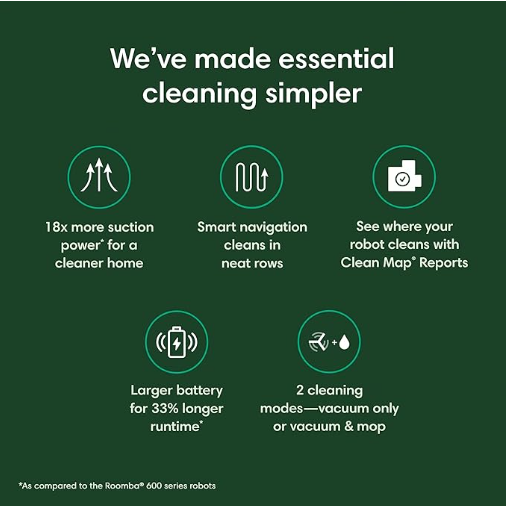 扫地机器人和拖把组合 (RVG-Y1) - 吸尘器和拖把,易于使用,强力吸力,多表面清洁,智能导航整齐清洁,自动充电 关于此产品 使用的 4 级清洁系统进行彻底清洁。强大的 4 级清洁系统一次性完成吸尘和拖地,使用特殊刷子进行边缘清洁,避免灰尘聚集。 像专业人士一样导航您的家。智能导航系统可有序地按整齐的行列进行清洁,而传感器则可帮助它绕过家具并避免从楼梯上摔下来。 开箱即用,轻松清除污垢。开箱即用,使用方便。只需几分钟即可设置您的机器人并开始清洁。 精心设计,简化清洁。iRobot Home App 通过“外出时清洁”、建议清洁时间表和清洁地图报告等功能简化您的生活,这样即使您不在家,您也始终知道 Roomba Combo Essential 机器人清洁了哪里。 小巧、智能,清洁无忧。时尚、低调的设计意味着它可以滑入更狭小的空间,清除床和沙发下的灰尘和污垢,而边缘清扫刷则可以进入边缘和角落。 可自行充电,您无需充电。一次充电即可清洁长达 120 分钟,当电池电量不足时,这款智能机器人会自动返回充电站充电。 您可以信赖的拖把。我们的内置拖把配有微型泵,可控制水流,并在清洁过程中保持拖地垫均匀湿润,从而清除污垢和灰尘。可清洗的超细纤维拖把垫可重复使用 30 次,并有三种拖地水位选择。 定制清洁。 3 级吸力加上 3 种不同的拖地水位选项,您可以定制地板清洁方式。 有额外的污垢?局部清洁就在这里。轻松找到地板需要特别注意的地方。使用局部清洁时,您的机器人会原地旋转,在一个地方清洁长达 2 分钟。 正确设置和操作。Roomba Combo Essential 机器人需要 2.4 GHz 网络进行设置和操作。设置后,请让机器人在 2.4GHz 下运行;您的手机可以恢复到 5GHz。