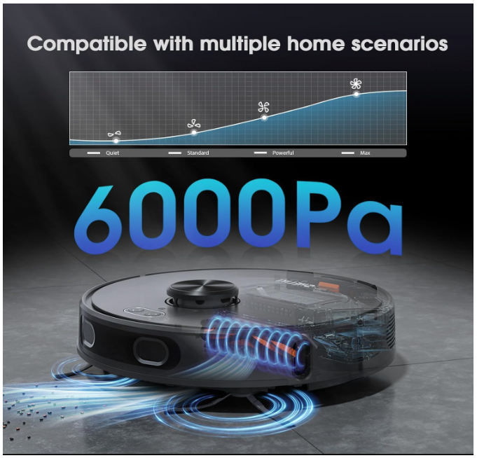 【Automatic Self-Emptying】The D60S MAX robot vacuum comes with an upgraded, extra-large dust bag that holds up to 70 days of dirt, so you spend far less time emptying it. Its powerful 5200mAh battery runs up to 220 minutes, enough to clean your entire home on a single charge. When the battery is low, the robot vacuum cleaner automatically returns to the base, recharges, and resumes cleaning right where it left off. (Dust bags are replaceable and easy to purchase.) 【360° LiDAR Navigation】Equipped with 360° LiDAR navigation, the D60S MAX robot vacuum and mop creates precise maps of your home, scanning each room and automatically dividing areas. It can save up to 5 maps, enabling smarter, more efficient cleaning than most robotic vacuums. Compatible with Alexa and Google Assistant, it responds to simple voice commands—just say the word, and your robot mop gets to work. 【6000Pa Powerful Suction】With up to 6000 Pa of suction, the D60S MAX robot vacuums easily lifts dust, debris, and pet hair from carpets and hard floors alike. Daily messes like crumbs and hair become quick and effortless to clean. Choose from four suction modes to match your needs: Quiet (800Pa), Standard (1600Pa), Strong (2700Pa), and Max (6000Pa). Works perfectly on hard floors, tiles, wooden floors, and low-pile carpets. 【Smart App/Voice/Remote Control】Control the D60S MAX robot vacuum and mop combo effortlessly via the Tuya Smart App. Schedule cleaning, adjust suction power, and set water flow to match your specific needs. Fully compatible with Alexa and Google Assistant, you can start cleaning with simple voice commands. (Note: 2.4G Wi-Fi is required.) 【Multiple Modes & No-Go Zone Settings】The D60S MAX robotic vacuum cleaner offers six cleaning modes: Zigzag, Spot, Edge, Auto, Scheduled, and Manual, giving you full control over your cleaning routine. You can set up to 14 no-go zones—perfect for carpets, pet areas, or delicate spaces—so the robot vacuum cleans exactly where you want. Improved sensors help it avoid obstacles and prevent falls from stairs or steep drops, keeping your home safe. Enjoy a spotless home with minimal effort.