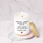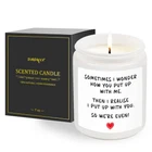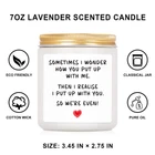 Anniversary Gifts for Him Her, 1st 30th 40th 50th Anniversary Valentine's Day Wedding Brithday Christmas Gifts for Him Her Boyfriend Girlfriend Husband Wife Couple, 7oz Lavender Scented Candles Product Detail: Materials: 100 Natural Soy Wax Measure: 2.75 * 2.75 * 3.54 inch Volume: 7 Fluid Ounces Burn time: Approximately 50 Hours Fragrance: Lavender Scented Package Includes: 1* 7oz Lavender Scented Candle 1* Exquisite Gift Box Customer Service: Lifetime Warranty ANNIVERSARY GIFTS FOR HER & HIM - 7 oz soy lavender scented candle with the sweet sayings printed on the front "Sometimes i wonder how you put up with me. Then i realise i put up with you so we're even!". Anniversary gifts for him, her, boyfriend, girlfriend, husband, wife, couple. Those who receive this candle gift will be filled with sweetness and happiness. VALENTINE'S DAY & BIRTHDAY GIFTS - As a wonderful candle gift for Valentines Day, Anniversary, Birthday, Christmas or any occasion with romance. This candle gift can express the deep love between two people and will promote each other's relationship. It is the perfect gift and decoration for any occasion and any holiday. 100% NATURAL SOY WAX - This candle is made by hand with 100% high-quality natural soy wax and premium essential oils. It burns more slowly and cleaner than paraffin wax, smokeless, harmless and non-toxic which is more beneficial to the environment and can be used for a long time with confidence. LAVENDER SCENT - This candle contains pure lavender essential oil, which emits a lavender scent when lit to help you sleep better, relax your body, regulate your mood, and reduce stress. And it also helps to freshen the air. Suitable for placement in rooms, studios, kitchens, living rooms, bathrooms, yoga studios, gyms. LAST FOR ABOUT 50 HOURS - A 7-ounce lavender scented candle burns for approximately 50 hours for a long-lasting fragrance. This scented candle with a 100% cotton wick guarantees a constant flame and maintains the ideal flicker range. We are committed to providing customers with a satisfactory shopping experience, please feel free to contact us if you have any questions.