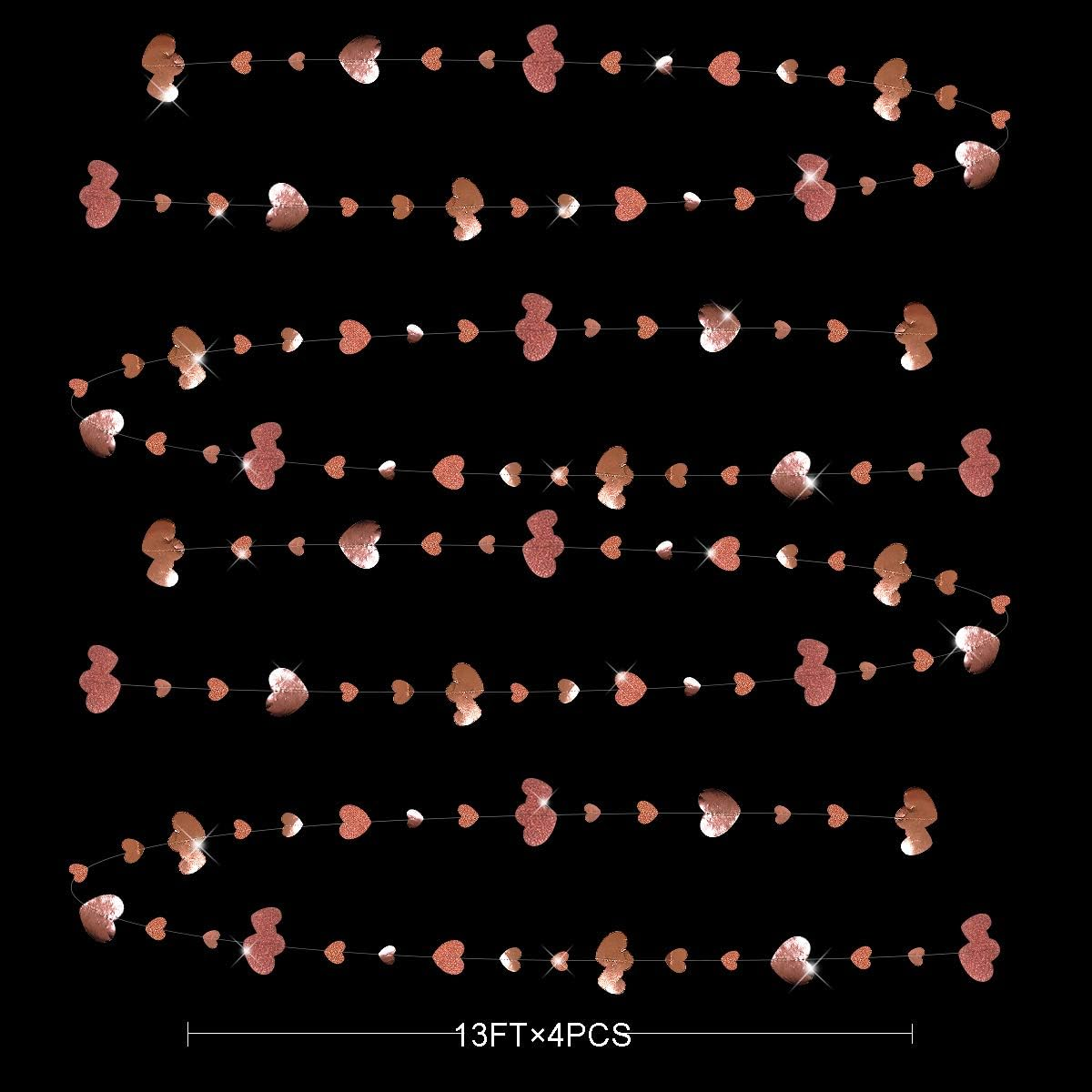 Package Contains- 4 packs of rose gold heart party decoration garland,each string is 13 feet/ 4 meters. Environmental Material-Our rose gold garlands are made of two materials paper alternately.Double sided metallic paper and glitter paper,high quality with neat cut,strong,durable and reusable. Asymmetrical Style-1 sets will contain 2 different permutation of glitter and metallic paper.You can DIY crop to any length you want. Let your decor design more eye-catching. Using Occasion-Perfect for decorating any parties.such as wedding,baby shower,birthday,bachelorette,engagement,bridal shower,graduation ceremony,valentines day,anniversary,hen party rose gold party decoration and so on. Product Warranty and Customer Service-We provide 48-day money-back and 24-month warranty. So feel free to contact us if you have any question. Product Description Our Rose Gold Party Decorations Heart Garland Kit Includes: 4 packs of rose gold glitter & metallic heart garland Dimension: Each string of the rose gold heart garland is 13 feet/ 4 meters.Total length is 52 feet/ 16 meters. 已申请版权保护,请勿抄袭,否则后果自负! MULTIPLE OCCASION: Heart decorations Birthday decorations Wedding decorations Christmas decorations Hen party decorations Graduation decorations Anniversary decorations MULTIPLE OCCASION: Bachelorette decorations Baby shower decorations Mother's day decorations Bridal shower decorations Valentines day decorations Rose gold party decorations Engagement party decorations WARM-TIP: Unroll & unwrap garlands carefully. Due to delicate nature of thread, may tangle. There may be dimension errors to some degree due to manual measurement. There may be some slight differences between the color tone of the pictures and that of the actual items due to lighting effects, monitor's brightness and contrast settings, etc.