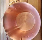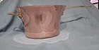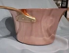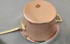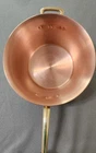 Beautiful large saucepan Polenta ? Pan. Pre owned in excellent condition. Brass Handles. 6" deep, 10.5" across rim. Weighs 1 lb 13 oz. Recently polished, does have a "stain" on bottom from possibly a sticker. It's not sticky but discolored. Some light scratches on bottom.