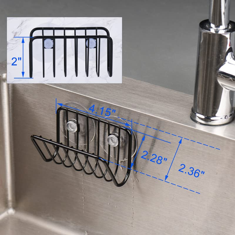 [Open Design] - This holder features an open design, making it easy to drain water and maintain cleanliness. It is constructed from high-quality steel and boasts a rustproof matte black finish, ensuring durability and a stylish appearance. [Multipurpose] - sponge holder can securely hold various kitchen or bathroom essentials, including soap, sponges, scouring pads, or drain stoppers. [Strong Suction Cups] - The product comes equipped with 2 robust plastic suction cups that provide a strong and secure attachment to smooth sink surfaces. Additionally, it includes 4 extra suction cups. [Use Instructions] - Simply stick the wet suction cup onto a smooth and clean surface and push out the air. Please note that this product is suited for smooth surfaces and may not work effectively on textured or porous surfaces. [Product dimensions] - The sponge holder is 4.15-inch x 2.36-inch x 2-inch in size.
