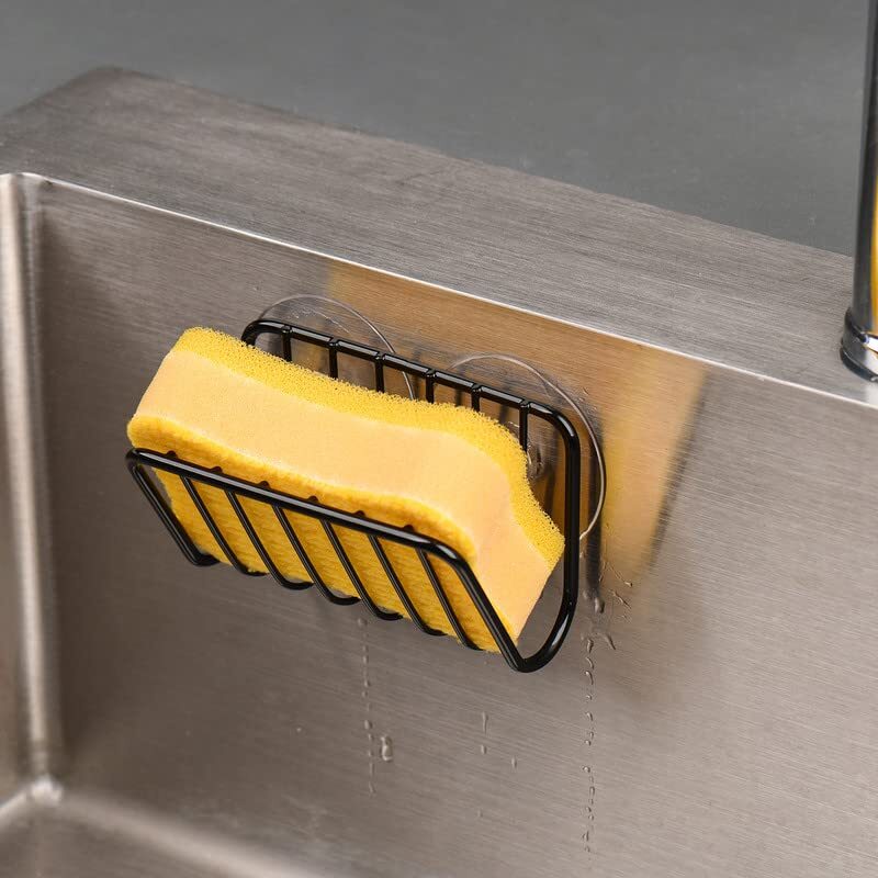[Open Design] - This holder features an open design, making it easy to drain water and maintain cleanliness. It is constructed from high-quality steel and boasts a rustproof matte black finish, ensuring durability and a stylish appearance. [Multipurpose] - sponge holder can securely hold various kitchen or bathroom essentials, including soap, sponges, scouring pads, or drain stoppers. [Strong Suction Cups] - The product comes equipped with 2 robust plastic suction cups that provide a strong and secure attachment to smooth sink surfaces. Additionally, it includes 4 extra suction cups. [Use Instructions] - Simply stick the wet suction cup onto a smooth and clean surface and push out the air. Please note that this product is suited for smooth surfaces and may not work effectively on textured or porous surfaces. [Product dimensions] - The sponge holder is 4.15-inch x 2.36-inch x 2-inch in size.