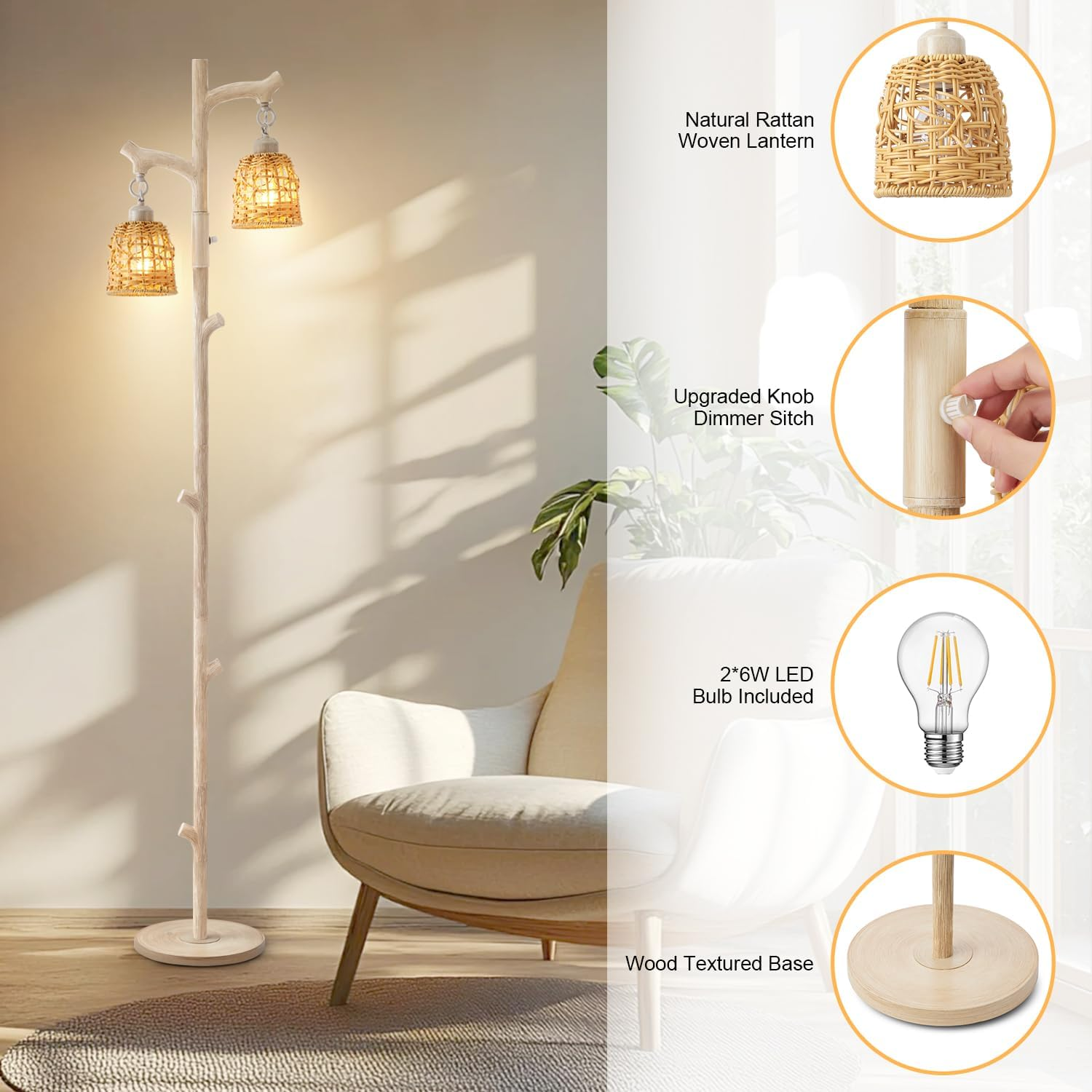 Store New Arrivals Add to Favorite View Feedback Contact 68" Rustic Farmhouse Floor Lamp for Living Room, Country Cottage Tree Trunk Floor Lamp with Wicker Drum Shade Stepless Dimmable, White Washed Resin Tall Standing Lamp for Bedroom Reading Room Description Item model number ZL-FL-SZ01 Light Source Type LED Style Farmhouse Number of Items 1 Power Source Corded Electric Number of Light Sources 2 Country of Origin China Batteries Included? No Lamp Type Floor Lamp Room Type Bedroom, Living Room Product Dimensions 15"D x 10"W x 68"H Material Resin Light Output Maximum 1200 Lumens Included Components Bulb Brightness 1200 Lumen Batteries Required? No Item Weight 13.04 pounds Special Features Energy Efficient, Dimmable Special Feature Energy Efficient, Dimmable Part Number ZL-FL-SZ01 Shade Color Original rattan color Color Temperature 2700 Kelvin Color Wash White Wattage 6 watts Base Material Resin Voltage 120 Volts Shade Material Rattan Base Diameter 10 Inches Switch Type Rotary Rustic Elegance Design: This 68" farmhouse floor lamp features a white washed tree trunk wood finish column and realistic wood grain texture, showing an elegant and unique style. Its design is inspired by natural trees. When you relax on the sofa or reading chair, you feel like you are under the tranquil shade of the tree and enjoy the tranquility of nature. The hand-woven wicker drum-shaped lampshade softly diffuses the light, creating a warm and comfortable atmosphere. Stepless Dimming( 0-100% ): Equipped with a dimming function adjustable from 0-100%, this lamp meets various lighting needs with a simple twist. Its minimalist and natural design style blends decorative appeal with practicality, making it ideal for illuminating country houses, cabins, and other nature-inspired spaces. 2 x 6W LED Bulbs Included: Our floor lamp has 2 E26 bulb sockets. It's compatible with standard E26 LED, CFL, incandescent, and halogen bulbs (dimmable only). The included E26 base bulbs last 25,000 hours, offering 6W (equivalent to 60W), 1,000 lumens, and 2700K (warm white) light. Safety & Durability: The Karjoefar rustic floor lamp features a 10-inch diameter wood-textured base that adequately supports the lamp, ensuring safe and stable placement even on soft surfaces like carpets. The lamp body, made of high-quality resin, ensures long-lasting beauty and excellent reliability, withstanding the test of time. Reliable Quality & Service: No tools are needed for assembly; simply follow the instructions to screw all parts together. If any issues arise during use, you can email us via Amazon's buyer-seller messaging system at any time, and we'll do our utmost to ensure a worry-free experience. Product Description Karjoefar Farmhouse Floor Lamp This floor lamp is inspired by a rustic log cabin and features a natural tree trunk shape. It easily fits into any furniture environment, whether it is a bedroom, living room, rustic space or office. It creates a simple, elegant and warm atmosphere for your space. 1 Living Room 2 Hallway 3 Bedroom How long can this resin floor lamp last and is it easy to maintain? Yes, our resin material is very durable and has excellent wear and impact resistance. Can this living room lamp provide sufficient lighting for the whole room? We provide 2*6W LED bulbs, which can provide 1200LM, making it perfect for nighttime baby/toddler care or rooms without ceiling lights. Can the brightness be adjusted? This rustic floor lamp is equipped with a knob dimming, which can provide 0%-100% infinite dimming. How about after-sales service? We provide 2 years of after-sales service support to ensure that you make a reliable decision. ABOUT US We offer the best prices around on high quality products. Our E-store includes media such as books, movies, music and games while offering electronics, toys, sporting apparel, clothing, tools, general home, garden items and more. SHIPPING We are always working hard to ensure your package arrives as soon as possible. Please understand that some factors like weather, high postal traffic, and the performance of shipping companies are outside of our control. We offer free shipping to the lower 48 states and ship within 2 business days of payment, usually sooner. We do not accept P.O. Boxes. Please provide a physical address. For shipping outside of the continental USA, we only use eBay's Global Shipping Program.The item is shipped to KY and then sent to the rest of the world. International customers are responsible for all duties and taxes. Continue to check out in order to calculate costs for shipping the item to your country. Messages regarding eBay's Global Shipping Program MUST be directed at eBay EXCLUSIVELY. RETURNS We offer a 30-Day Return Policy on items which you are not completely satisfied with. You have the option for a full-refund or an exchange of the item. No returns are available on items shipped outside of the USA. PAYMENT We accept PayPal. CONTACT US This page content is yet to come Please ad us to your favorite seller and visit again later Thank You CUSTOMER SATISFACTION We try our very best to make sure every customer is completely satisfied. If there's a problem, message us! We're happy to help.
