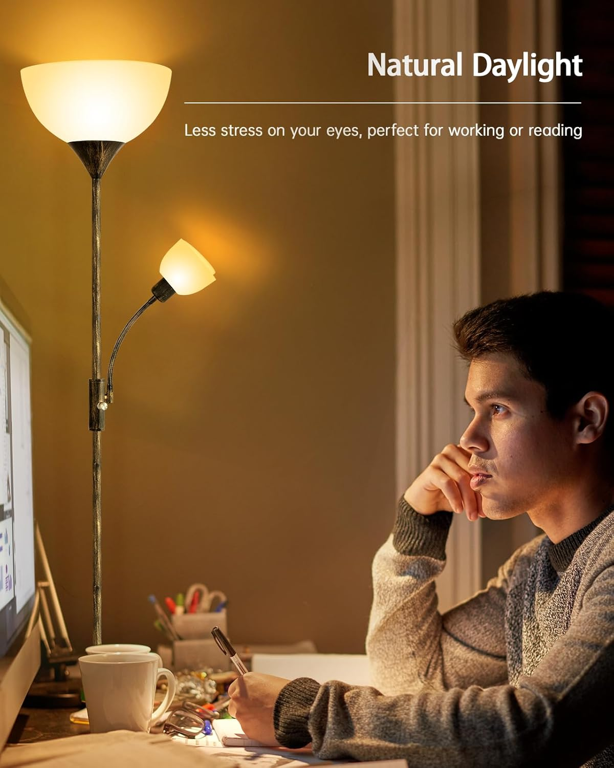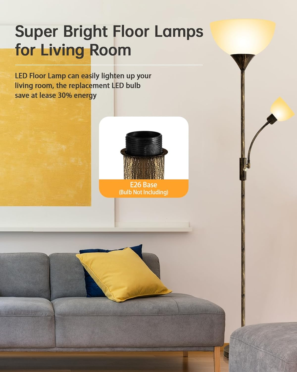 Store New Arrivals Add to Favorite View Feedback Contact Floor Lamps for Living Room, Standing Lamp, 71" Torchiere Floor Lamp with Reading Lamp, 3 Way Switch, Corner Floor Lamps for Living Room/Bedroom, Rustic Bronze Floor Lamp(E26 Base, No Bulb) Description Light Source Type LED Style Vintage/Modern/Rustic/Simple/Coastal/Country Number of Items 2 Power Source Corded Electric Number of Light Sources 2 Control Method Remote Lighting Method Uplight Torchiere Floor Lamp and Adjustable Reading Lamp Mounting Type Floor Mount Lamp Type Floor Lamp Number of Pieces 1 Room Type Living Room, Bedroom Assembly Required Yes Efficiency Energy Efficient Product Dimensions 11"D x 7"W x 15"H Material Metal Installation Type Freestanding Finish Type Metallic Pole, Plastic Lampshade Specific Uses For Product Decorations for Living Room/Bedroom/Office/Den/College Dorm/Apartment/Hotel Included Components Integrated 9W, 4W LED beads Indoor/Outdoor Usage Indoor Brightness 1200 Lumen Batteries Required? No Item Weight 6.98 pounds Connectivity Technology USB Special Features Tall Lamp with Flexible Reading Lamps, Strudy Base Floor Lamps, LED Standing Lamp, Bright Torchiere Floor Lamp, 3-Way Rotary Switch Special Feature Tall Lamp with Flexible Reading Lamps, Strudy Base Floor Lamps, LED Standing Lamp, Bright Torchiere Floor Lamp, 3-Way Rotary Switch Shade Color Black,Bronze,White Shade Height 56 Inches Bulb Shape Size A19 Color Temperature 2700 Kelvin Color Bronze Floor Lamp(No Bulb) Wattage 12 watts Is Cordless? No Base Material Metal Is Waterproof False Shape Dome Voltage 120 Volts Recommended Uses For Product Decoration,Reading Shade Material Metal Finish types Metallic Pole, Plastic Lampshade Switch Type 3-Way Rotary Switch 【Updated E26 Base Floor Lamp】The torchiere floor lamp designed with E26 base, it can used universal bulb, like LED, halogen or incandescent bulbs. The standing lamp with plastic lampshade keep a cool touch even after hours of use, so no worries about the overheating issue. Note: Bulb not included. 【Decorative Floor Lamp with 2 heads】With the unique bronze finish design, BoostArea 12W torchiere floor lamp comes with a 4W flexible side reading light, the gooseneck allows you to adjust angles to illuminate your projects, like reading, working or daily use; Emitting 2700K warm white light, the Eye-caring floor standing lamp will not harm your eyes; Also, with the 3-way rotary switch, you can choose seperate lights or both ON/OFF according to different needs 【Safe and Easy Assembly】We take safety seriously into consideration, with a stable base and metal pole, this floor lamp for bedroom provides good stability from falling, which is safe for your baby and pet; it can also be easily placed in the office, classroom, living room, and other places; Simple and easy to assemble within 5 mins without extra tools, you just need to screw all the parts correctly of the LED floor lamps working together by following the instruction video on the page 【Vintage Design Decor】Thanks for the space-saving design, the office standing lamp can straight stand easily in any corner, slide it behind a couch or place it beside nightstand, and you can move it easily into various places in your home; Besides, its slim design makes it not only tall floor lamps for bedrooms, floor lamps for living room or office, but also a cool decoration to girls or boys room; The standing floor lamp fits well with urban, mid-century modern, casual, or contemporary decor 【Compatible with smart devices】You can plug the standing lamps for living room in the smart plug (not included), or connect it to a wall switch (not included); Add the tall floor lamp to your home appliances group, and easily controlled this 9W + 4W torchiere floor lamp by your phone; Intelligent design of room floor lamps for bedroom help you enjoy easier life and home automation Product Description BoostArea LED Torchiere Floor Lamps for Livng Room/Bedroom/Office - Bright Up Your Home, Decor Your Life! Unique Features: Easy to use - This bronze floor lamp can simply control by the 3-way rotary switch, you can choose Main Lamp On, Side Lamp On, or Both Lamps On. No need to get up while you're on the sofa. Make your life more convenient Much Easier - Double E26 Base, the standing floor lamp generates warm white colors, offer the brighter lighting to house Much Taller - 71 inches (180cm/6 feet), easy to light up your space More Stable - 7.2 pound lamp base offers better stable, don't worry tipped The adjustable gooseneck of the side lamp allows you to adjust the angles to illuminate your projects, like reading, working and daily use; Equipped with E26 base, this bronze vintage standing lamp can save electricity bills for you in the long term. Your safety is what we always keep in mind; Adopting a sturdy and weighted base and a metal pole, this bright floor lamp ensures excellent stability; The stylish and thin design allows it can easily fit any corner of your home. This living room floor lamp has better safety performance, all lamps have SGS Certification, we can offers 1 YEARS QUALITY PROMISE, if you have any concerns/suggestions, just contact BoostArea Service. East to Assemble Are you looking for a floor lamp with a unique design and also a 100% match with your home style; BoostArea modern floor lamp is your ideal answer; BoostArea vintage standing lamp gives you much more space to design according to your home style and your own taste Brighten up your life When you turn on the reading floor lamp, you can feel relax at home. Enjoy your beautiful leisure time. ABOUT US We’re dedicated to bringing you great deals on quality products. From home décor and garden essentials to tools, hardware, and pet accessories, our store has something for everyone — all at prices you’ll love. SHIPPING We ship all orders directly from the USA for fast, reliable delivery. Most items ship within 1 business day and include free shipping to the lower 48 states. Fo