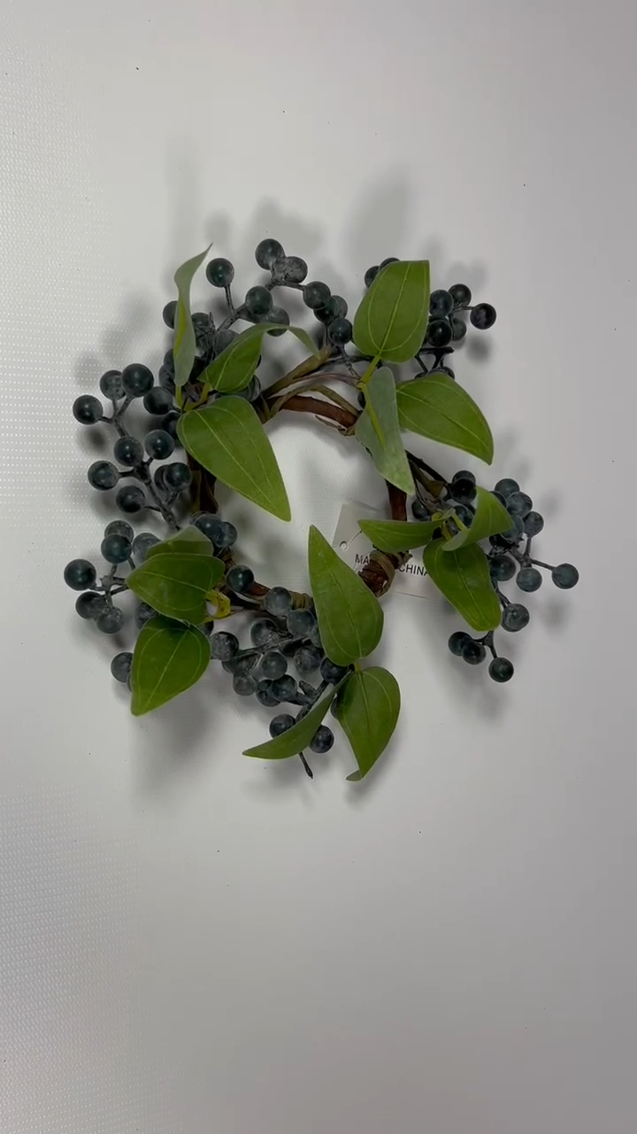 This 2.5” artificial blueberry candle ring is the perfect rustic accent for your home. Designed with lifelike navy berries on a flexible brown twig base, it fits beautifully around pillar candles, jars, or small vases. Whether used as part of a centerpiece, on a shelf, or for seasonal styling, this faux mini wreath adds charming farmhouse elegance to your decor. Durable, reusable, and easy to style.