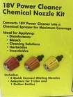 The Chemical Nozzle Kit is ideal for applying disinfectant, bleach, cleaning solutions, herbicides and insecticides for ultimate versatility and maximum coverage. Easily attach 1 of the 3 quick-connect nozzles to the RYOBI Power Cleaner to create low, medium and high coverage mist. Includes: 3 quick-connect nozzles (low, medium and high), 2 l and 1 Gal. bottle adaptors 5 ft. hose and quick connect adaptor Nozzle droplet size: 50 mic, 70 mic, 160 mic Bin 3 PA