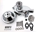 SB Chevy Water Pump "Short" Style & Chrome Double Groove Pulley High grade aluminum water pump, this pump will flow up to 40% more coolant than stock pumps, it will dissipate heat better than the regular OEM cast iron pumps, also lighter. This pump features high quality roller bearings, custom impeller for maximum water flow and reduced cavitation at high RPM's. This pump will clear cam belt drives and most blower drives. High Quality Chrome Plating! Pump Features: Application: This Pump Originally Came on: 1955-68 SB Chevy 283-350 V8 Passenger Cars, 1969-70 Corvettes with 350 V8 Engines, 1955-1972 Light Duty Trucks with 350 V8 Engines, However, this pump will fit all SB Chevy blocks up to 1985. Material: Aluminum. Finish: Chrome. Specs: 5/8" Pilot, 1/2" NPT side port. Pulley Flange: Dual Bolt Pattern. Package: Water Pump, Gaskets to mount to block & Plug. Rotation: Standard. Kit Includes: Chrome Aluminum Water Pump Pulley Shims (2) 1/2" NPT Plug Stainless Water Pump Bolt Kit - Hex Polished Gaskets to Mount to Block (2) Chrome Pulley - Double Groove Pulley Bolts & Lock Washers - Hex (4) *NOTE: Please make sure this is the correct pump you need before buying, this is a "SHORT" water pump, it measures 5-5/8" from engine block to pulley flange (see picture attached), there is a LONG pump also available in our store.