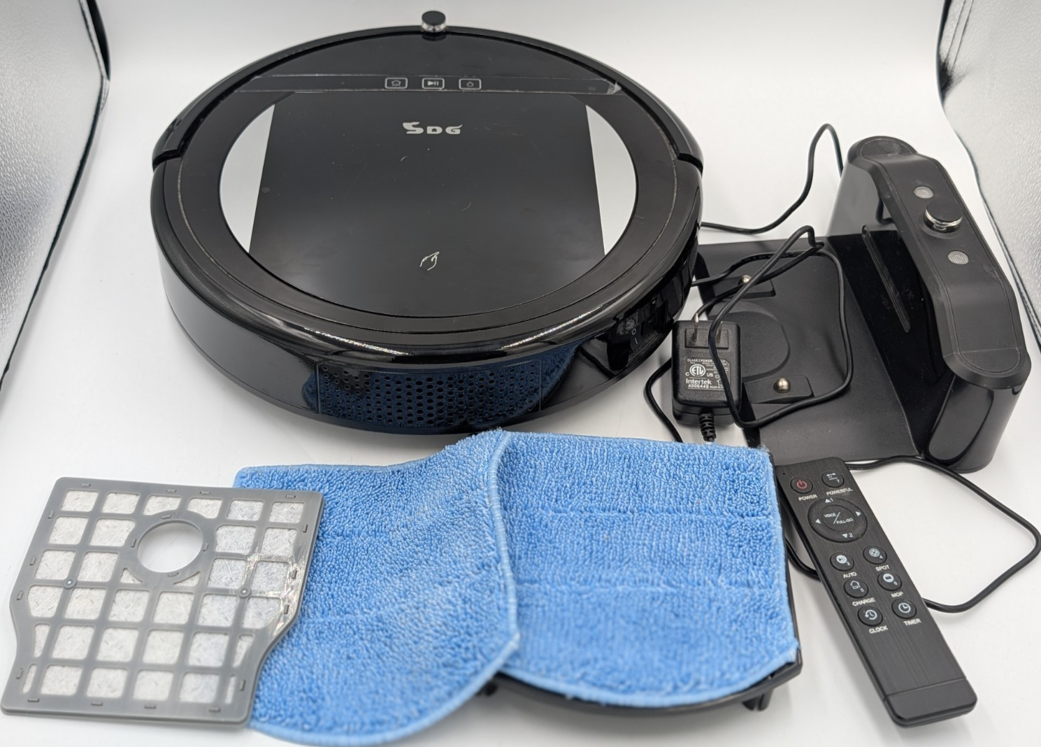 SDG S018 Robot Vacuum and Mop Combo Robotic Vacuum Cleaner, Dock, Remote, Filter Mop pads. Pre-owned with signs of use but overall good condition. See pictures for all included.