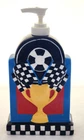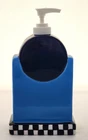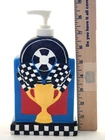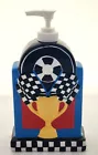 Unique soap dispenser. This is a 7.5" tall ceramic dispenser. The front has a tire, with two checkered flags and a yellow trophy. The bottom is a black & white check. The back and body of the dispenser is a bright blue. It has a white plastic pump. This had soap in it. I have rinsed it well and tested the pump. There may be some slight bubble left, but it would be very little. This is a unique dispenser for any room. Click HERE for other HOME DECOR Items In My Store Click HERE for other NOVELTY Items In My Store