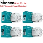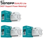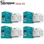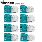 SONOFF DUALR3/R3 Lite DIY MINI Smart Switch 2 Gang Dual Relay Module With Power Metering Control Via eWeLink Alexa google home SONOFF DUALR3 Dual Relay Module DIY MINI Power Metering Smart Switch Two Way Smart Home Control via eWeLink Alexa Google SONOFF DUALR3 takes your home to the next level. DUALR3 is a flush-mounted Wi-Fi smart dual relay switch module that is installed behind any standard switch to transfer it into a smart switch for wireless remote control with mobile devices or voice command. Unifying your home appliances into an integrated wireless network to make them communicate with one another which is convenient for you to manage and control, including lights, home appliances and motorized facilities like roller shutters, window shades, blinds, awning, etc. It’s TUV certified that provides a reliable quantity and advanced safety, without having to worry about the potential risk of fire and overheat. Three working modes available. DUALR3 comes with switch mode, motor mode and meter mode. One of the typical features is roller shutter and window shades smart control in the motor mode. The switch module offers the ultimate flexibility for your roller shutter and window shades by app remote control and scheduling timed events no matter whether you are home or away. Double two-way control. The double relay switch module distributes the load to two inputs compared to the simple relay, which this working mechanism lets you have two-way control for two devices independently. Power metering. What’s more, the module has an energy monitoring function that can be used to determine the exact energy consumption of the connected devices. In this mode, the load of electrical appliances connected with DUALR3 will always remain on and its relay status will not be changed on the app or the extra switch, used for power tracking and metering only. Powerful compatibility. In eWeLink app, you can manage your roller shutter to make it open, close and even stop at a certain position that you want. Designed to work with more switch types like the momentary switch, rocker switch, ON/OFF switch, dual momentary switch and ON/OFF/ON switch and then you can control your home appliances or motorized devices via the extra wall switch. Siri voice control. By setting up Siri shortcut in eWeLink that allows you to control your curtains with your voice. Even you can create a smart scene to make it keep linkage with other devices in your home, for example, ask Siri to close the curtain to trigger L1 Lite light strip on for an immersive movie night at home. NOTE: This link is for 1-20pcs combination of DUALR3, please confirm before purchase. DIY Your Automated Motorized Facilities DUALR3 can operate as a smart control module for 100-240V motors. Like tubular motor used in motorized curtains, blinds, roller shutter, awning, etc. Schedule to Open and Close for Comfortable Life Want to be awakened with the first ray of sunlight in the morning or adjust the percentage of curtain opening to avoid the light ruins your furniture? DUALR3 can help you easily realize, just connect it with your motorized curtain to enjoy your samrt life. Control It Wherever You Are Don't worry about the rain, close the window remotely. Creating an Atmosphere. Actually Simple DUALR3 works with other SONOFF products like L1. Just tell Siri and it will automatically close the curtain for you to create a romantic atmosphere. * Siri voice control is a shortcut of Siri in eWeLink. DUALR3 does not support Homekit temporarliy. Double Two-Way Control of Lights To control the lights via downstairs or upstairs switch? DUALR3 helps you! The working mechanism of DUALR3 allows you to achieve two-way control for two appliances respectively. Power Metering Helps You to save on Electricity Bills Want to turn off in schedule to save electricity bills? Want to check the real-time power of the appliances? Want to view historical power consumption? Keep Your Appliances always Be On-Meter Mode DUALR3 has a special working mode called meter mode. In this mode, the electtical appliance loads of DUALR3 will always remain on, the relay state will not be changed by APP or external switches. Only focusing on power monitoring and metering. Safety is Guaranteed Compatible with Your Existing Various Switch Types In addition to APP control, the original switch control can be retained. Specification of DUALR3 Power Supply: 100-240V AC Max Current: 15A(total),10A(1 gang) Max Power: 3300W(total) / 2200W(1 gang) Product Dimensions: 54*49*24mm Color: White Frequency: 802.11 b/g/n Security Mechanism: WPA-PSK/WPA2-PSK Humidity: 5%-95%RH, Non-condensing Enclosure Material: Fire-retardant ABS V0 Operating Temperature: -10ºC-40ºC Gang: 2 Product Details
