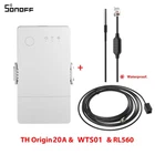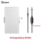 SONOFF TH Origin (the upgrade version of TH10/TH16) is a smart temperature and humidity monitoring switch with ESP32 chip, it keeps monitoring the temperature and humidity in real time, once they reach your preset threshold or the device's on/off state changes, you will receive the push notification on the phone. SONOFF TH Origin supports 20A/16A max loads, compatible with more home appliances. TH Origin support to check 6-Month Temp & Humi historical data accurate to the hour. In the smart scene, temperature, humidity, on, off support setting as the trigger, on, off, invert as execute actions. Support adding SONOFF devices to Home Assistant for control and automation through eWeLink add-on. SONOFF TH Origin supports three kinds of temperature monitor and humidity monitor sensors—THS01 Temp & Humi Sensor, DS18B20 waterproof Temp sensor, and MS01 Soil Moisture Sensor. The sensor connector is upgraded to RJ11, supporting hot-plugging making the connection more stable and reliable. So TH Origin has wide application scenes, like heated swimming pool, irrigation system, fermentation room, reptile terrarium, greenhouse grown, etc. The RL560 sensor extension cable can connect the SONOFF temperature and humidity sensors to extend your device's distance. THS01, DS18B20 can be extended to 60M, and MS01 Soil Moisture Sensor can be extended to 10M. You Safety, Our Responsibility 1. Strictly selects UL safety components and RoHS environmental protection materials to design the products. 2. The high-grade flame-retardant shell material is used. 3. Cut off high voltage generated by a lightning strike or unstable power supply when thundering. Different Sensors for Different Scenes The sensor connector is upgraded to RJ11, supporting hot plugging making the connection more stable and reliable. Reliable Temp & Humi Control TH supports LAN control, Wi-Fi disconnected will not affect the operation of your device. 6-month Temp & Humi History Data Support to review the temp & humi history data by hour, day and month. Past 6-month history data can be exported in .xlsx format and accurate to hour. Timely Notifications TH keeps monitoring the temperature and humidity in real time, once they reach your preset threshold or the device’s on/off state changes, you will receive the Push notification on the phone. Voice Control Note Note 1: THS01 and DS18B20 (RJ11) are the sensors of the RJ11 jack, just plug into TH Origin to use. Note 2: The RL560 is the new sensor extension cable of RJ11, it can connect the SONOFF temperature and humidity sensors to extend your device’s distance. DS18B20, THS01 can be extended to 60M, and MS01 soil moisture sensor can be extended to 10M. THS01 Sensor Sensor Type: Temperature & Humidity sensor Connector type: RJ11 4P4C Temperature Measuring Range: –40℃~ 85°C Humidity Measuring Range: 0~100%RH Cable Length: 50cm DS18B20 Sensor Sensor Type: Waterproof temperature sensor Connector type: RJ11 4P4C WorkigTemperature: -55℃~ 125℃ Length: 50cm RL560 Sensor Extension Cable Conductor resistance: max.10Ω Insulation resistance: min.5MΩ Length: 5m cable length & Max. 60m extendable length. MS01 Sensor Sensor Type: Soil Moisture Sensor Humidity Measuring Range: 0~100%RH Operating Temperature Range: 0℃~60°C Cable Length: 50cm