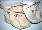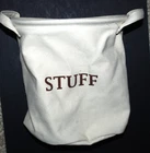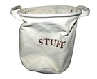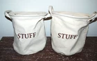 STUFF Utility Canvas Carry Bags With Handles Organizing Storage Totes Lot of 3. They each measure 11" tall by 10" wide by 9" deep. Add practical functionality to your space with this Lot of 3 Vintage STUFF Utility Canvas Carry Bags . These sturdy, classic totes are made of durable canvas material, featuring reinforced handles and a spacious, open-top design perfect for everyday storage and organization. Whether you’re tidying up craft supplies, tools, books, or pantry goods, these bags offer both style and substance. Each bag is marked with bold “STUFF” lettering on the front, lending a playful yet vintage industrial vibe. Great for home, garage, car trunk, or office use. Features: Lot of 3 matching canvas utility bags Sturdy canvas construction with reinforced stitching Dual carry handles for easy transport Printed with bold “STUFF” text for a retro look Ideal for storage, organizing, transporting items Vintage aesthetic with authentic wear and character Approximate Dimensions (each bag): 11" tall by 10" wide by 9" deep. Perfect for lovers of rustic décor, vintage storage solutions, or anyone looking to add character and function to their organizing game. Cosmetically, the carrying bags are in very nice pre owned condition with no rips or tears. They're very sturdy and clean. Overall, they're really nice with very minimal signs of age marks or spots.