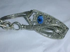 Add a touch of exotic elegance to your wardrobe with this stunning Bali bracelet. Crafted from bold sterling silver, this bracelet features a beautiful chain style adorned with A large sparkling blue quartz gemstone- plus topaz, Moonestones, Amethyst and Citrine sotnes. The bracelet is 7 3/4" to 8 3/4" long and is perfect for any occasion. The piece is made with 925 metal purity and is a wonderful addition to any fine jewelry collection. The bracelet's unique style and design reflect the beauty of Bali, making it a must-have for anyone who loves exotic fashion. Don't miss out on the opportunity to add this beautiful bracelet to your collection. DESCRIPTION: Hallmarked: 925 Weight: 28.67 Grams Width: 1 1/4" wide by 2 3/8" across the Centerpiece the band has a double chain and a toggle clasp Length: Can be worn from 7 3/4 to 8 3/4" long It looks just stunning on the Wrist! Free US domestic shipping , international shipping is available at actual first class rates. Please see my other listings for more great jewelry.