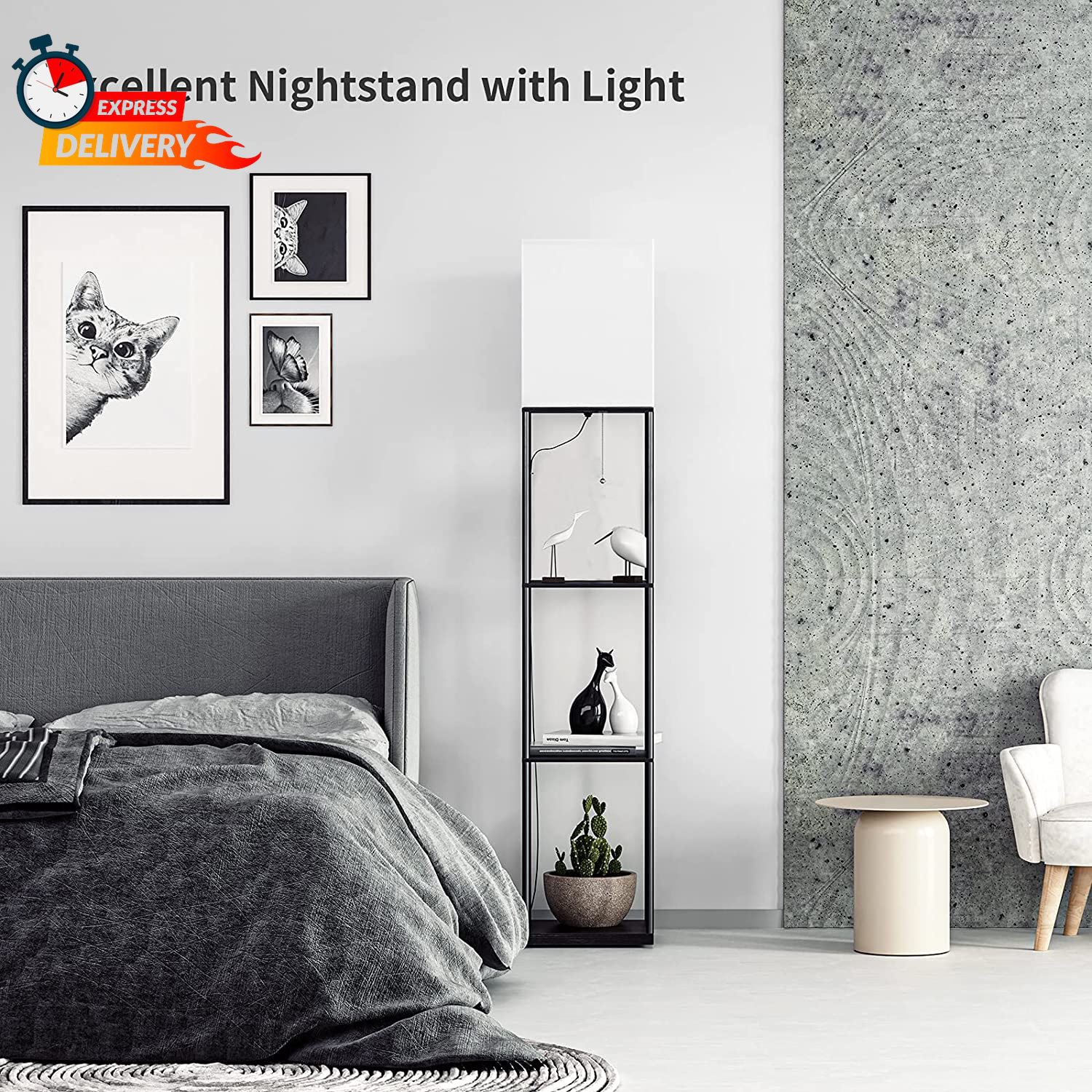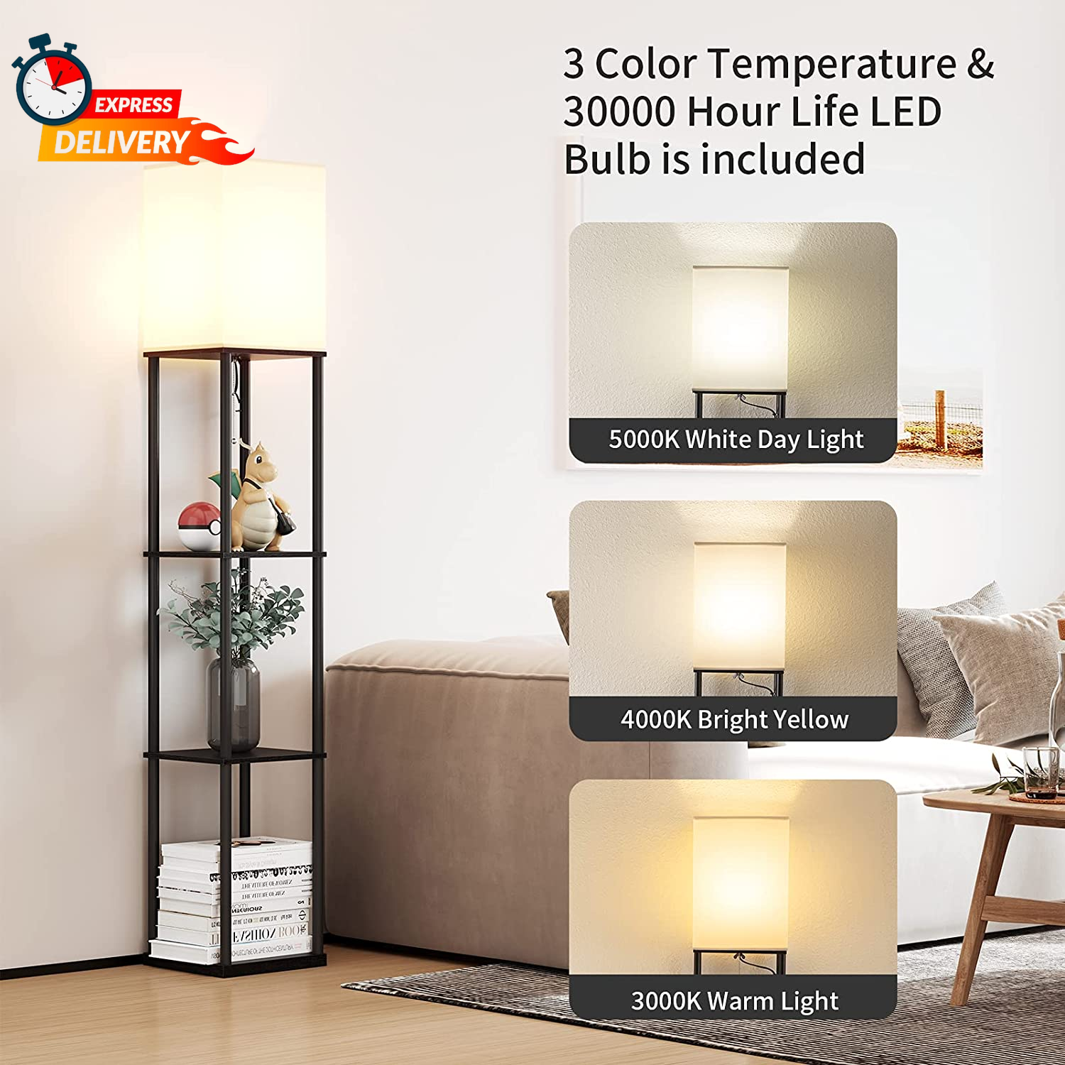 Store New Arrivals Add to Favorite View Feedback Contact SUNMORY Floor Lamp with Shelves, Modern Square Standing Lamp with 3 Color Temperature Bulb, Corner Display Bookshelf Lamp for Living Room and Bedroom(Black) Description Item model number MF19308 Light Source Type LED Style Modern Number of Items 1 Power Source Corded Electric Number of Light Sources 1 Control Method Touch Batteries Included? No Lighting Method LED Mounting Type Floor Mount Maximum Compatible Wattage 60 Watts Number of Pieces 1 Room Type Bedroom, Kids Room, Living Room, Office, Study Room Lamp Type Floor Lamp Assembly Required Yes Installation Type Freestanding Average Life 30000 Hours Product Dimensions 10.2"D x 10.2"W x 63"H Material Metal, Wood Efficiency High Controller Type Pull Chain Finish Type Painted Specific Uses For Product Atmosphere, Decoration, Lighting, Reading Manufacturer SUNMORY Bulb Features Dimmable,3000K-4000K-5000K Indoor/Outdoor Usage Indoor Brightness 800 Lumen Is Waterproof False Water Resistance Level Not Water Resistant Batteries Required? No Item Weight 10.06 Pounds Connectivity Technology IR Connectivity Protocol Wi-Fi Special Features Adjustable Color Temperature, Dimmable, Energy Efficient, Memory Function, Shelves Special Feature Adjustable Color Temperature, Dimmable, Energy Efficient, Memory Function, Shelves Shade Color Off-white Part Number L010401 Bulb Shape Size A19 Color Temperature 5000 Kelvin Color Black Wattage 9 watts Is Cordless? No Base Material Wood Bulb Base E26 Shape Square Voltage 120 Volts Recommended Uses For Product Corner, Decoration, Lighting, Reading Shade Material Linen Finish types Painted Included Components 3 color temperature bulb x 1, 4-tier shelf, E26 lamp holder x 1, Fabric shade x 1, Iron Rod x 12 Brand SUNMORY Switch Type Pull Chain 3-Color Temperatures LED Bulb Included: SUNMORY shelf lamp includes a 9 Watt, 800 lumen power saving LED bulb, so you don’t need to buy extra bulb; The LED lamp bulb is 3 color temp: 3000 K / 5000 K / 4000 K; You can switch different color temperatures according to different scenes; Also can work with smart outlets that are Alexa, Google Home Assistant, or Apple HomeKit enabled(requires smart outlet sold separately) Non-glaring Cloth Lampshade: This shelf floor lamp is equipped with a high-quality off-white cloth lampshade and opens upwards; With the built-in three-color temperature bulb, it can be used for both functional lighting and ambient lighting, It is a piece of furniture that can decorate any style of room Storage and Display: Crafted from high-density fiberboard, this tall lamp features shelves each supporting over 50 pounds, delivering ample storage space and enhanced stability. It stores books, photo frames, decorative items, plants, and phones. Doubles as a corner lamp or nightstand with lamp Minimalist Design & Versatile Style: The contemporary stand up lamp matches asian, mid century modern, rustic, country and farmhouse decor thanks to its diverse lighting effects and simple lines. This shelf lamp is the perfect home decoration and an ideal gift for the holidays Easy to Assemble: SUNMORY shelf floor lamp has been improved in craftsmanship and simplified the installation steps; Compared with other similar products, it will save you 30% percent of installation time; The accompanying package comes with the tools needed for assembly and an instruction manual containing text and video installation steps Product description SUNMORY-Light the world, warm your heart SUNMORY is obsessed with providing high-quality lighting and furniture designed for a cozy life. We work to make design inclusive, simple, elegant, and available for various living spaces as well as promoting to light up your life. 1 For your living room 2 For your studyroom 3 For your bedroom Apply to different scenarios Working Time Make work easy and enjoyable When you work, our floor lamp can silently accompany you and bring you light. Movie time Make you feel more relaxed After a hard day's work, sit quietly on the sofa, turn on your favorite movie, with warm yellow lights, and quietly enjoy the relaxation of the whole body and mind. Reading Time Make reading more comfortable At night, read a book quietly, with your family, accompanied by our floor lamp. 3 color temperatures We provide a 3-color temperature bulb, you can choose the light you like, and create different atmospheres E26 Base & LED Bulb This SUNMORY shelf lamp comes with a 3-color temperature bulb, you can also buy a bulb that matches the E26 base, like A19/ST64/ST58. Robust & Easy to Assembly SUNMORY shelf floor lamp has been improved in craftsmanship. Compared with similar products, it will save you 30% installation time. Strong & Durable Shelves Each shelf is made of high-density fiberboard, with a maximum load-bearing capacity of more than 50 pounds. You can place heavy objects like books. Put the shelf lamp anywhere you prefer, beside your bed, beside the TV, beside the sofa. Our floor lamp is slim and can be placed in the corner, beside the bed without getting in the way. Simply pull the switch to change the color temperature to find your favorite light 1 In different places 2 Save space 3 3 color temperatures The video showcases the product in use. The video guides you through product setup. The video compares multiple products. The video shows the product being unpacked. Every home is a little world, light and warmth belong to you. We are committed to exploring the harmonious unity of science and nature, practicality and beauty. Not only bring you convenience but also decorate your home. Tips: The shelf floor lamp needs to be assembled before use. Shelf lamp SUNMORY Floor lamp 800LM Brightness 800LM 3-Color Temperature Color temperature 3-Color Temperature Pull switch Switch mode Pull switch No Remote control No Wood+fabric+metal Material Wood+fabric Yes Bulb included Yes 9W Bulb power 9W 800LM Brightness 800LM 3-Color Temperature Color temperature 3-Color Temperature Pull swi