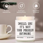 "Hi there! Welcome to the best Gift Manufacturer in the world --- . " We're a small gifts manufacturing company with passion for creativity. Being creative makes us happy and is what drives us to create beautiful signs that promote communication and safety. Having trouble finding a memorable retirement gift for a special one in your life? This scented candle features a witty and funny statement on its label, making it a retirement gift that the recipient will surely enjoy. This is especially true if she's a believer in aromatherapy or someone who loves to collect candles in her home. Why Choose our Aromatherapy Candle? Evenly burn without tunneling, the aroma fills your space quickly. Healthier for you, no toxic fumes are released. Glass packaging (that can be recycled or even reused). Travel size: 3.4 x2.8inches, easy to carry. 7oz, 35h Burn time, Long-lasting scent. Warm Notes: 1. Keep the candle somewhere shady and dry. High temperature and exposure to sunlight can melt the surface of the candle, thereby diminishing the fragrance. 2. Keep the wick trimmed to 0.2-0.3 inches can help the candle burn evenly and ensure long-term use. 3.It is recommended that the candle should not be lit over 4 hours every single time. 【RETIREMENT GIFTS FOR WOMEN MEN】- This candle is a funny gift to wish retiring or newly retired person a happy retirement. If you have a coworker, friend, family member, dad, mom, grandma, grandpa, wife, husband, sister, brother, employee, manager, or boss who is going to retire, give them this humorous candle which put a smile on their face and help them enjoy this special moment. 【CANDLE GIFTS FOR ANY OCCASION】- For one who always fixes problems, the best blessed quote is “not your problem anymore.” Whether retirement party, christmas, farewell, this candle is a great gift idea to congratulate them into next chapter of life, as well as a thoughtful leaving gift, divorce gift, breakup gift or goodbye gift to motivate them to start new journey. 【PLESANT FLORAL SCENT & REUSABLE JAR】- Featuring lavender and eucalyptus scent, the scented candle sets a comfortable mood for those who have worked hard for decades. After full use, this glass jar can be used for decoration and also suitable for placing your small objects. 【CLEAN & LONG-LASTING BURN】- Made with soy wax, this sentimental candle is hand poured in small batches so that you always receive a pure perfect one! Cotton wicks and premium fragrance ensure a clean and even burn, making it destined to burn for a long time, about 35 hours. This scented candle with a 100% cotton wick can provide a constant flame and maintain the ideal size without flickering. 【FUNNY GIFTS READY TO GIVE】- A novelty last minute gift for female or male you appreciate. All candles come packaged in a sturdy box to guarantee it’s intact after delivery. If you are not fully happy with your purchase, please reach out to us directly and we will take care of your issue.