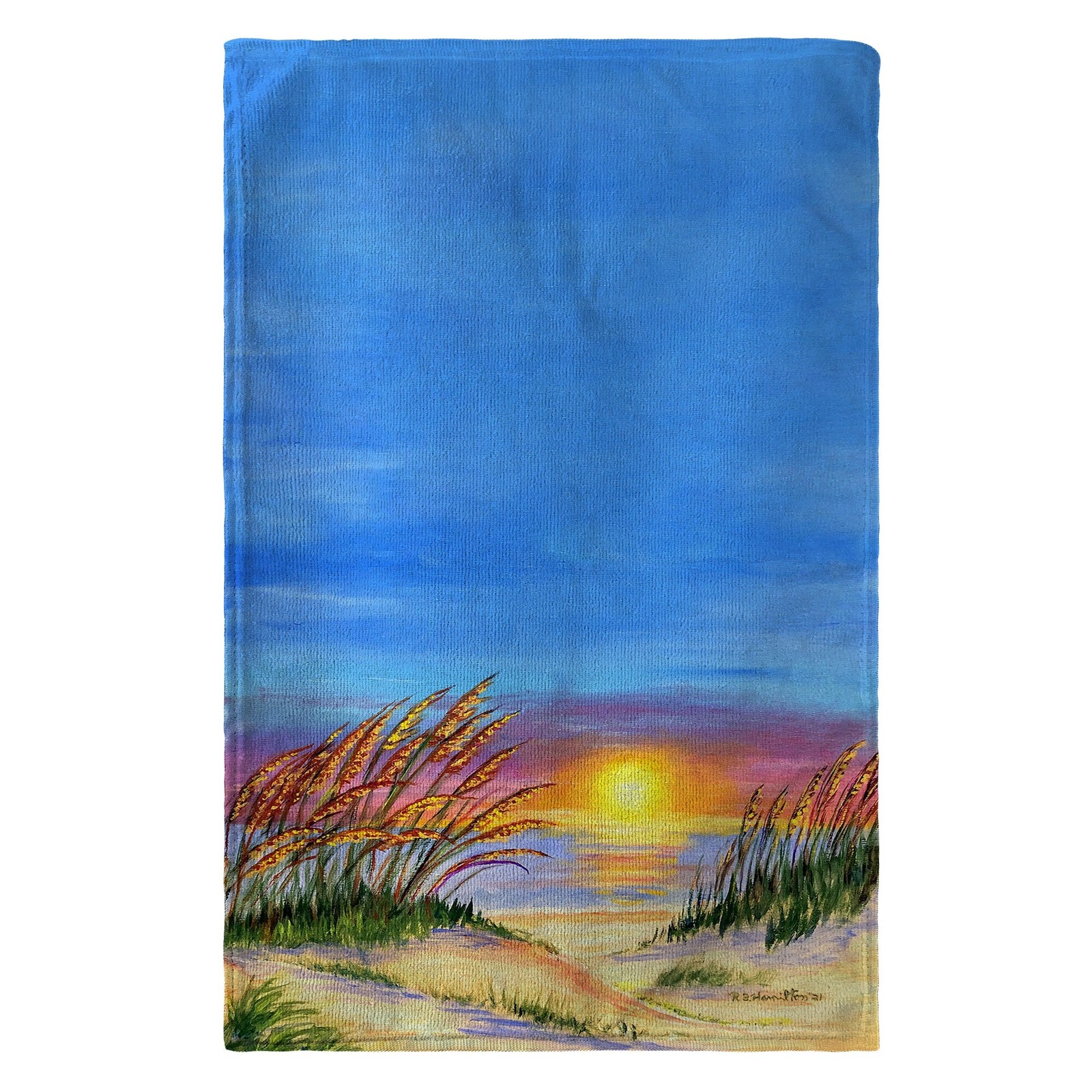 New microfiber and cotton 16" x 25" absorbent kitchen towels. Can be used indoors or outdoors. All of our products are based on designs by artists R.B. Hamilton and Betsy Drake and are printed in the USA from imported materials. Free Shipping Over $49.99* Details Sea Oats Sunrise Kitchen Towel - 16x25 Product Description: New microfiber and cotton 16" x 25" absorbent kitchen towels. Can be used indoors or outdoors. All of our products are based on designs by artists R.B. Hamilton and Betsy Drake and are printed in the USA from imported materials.