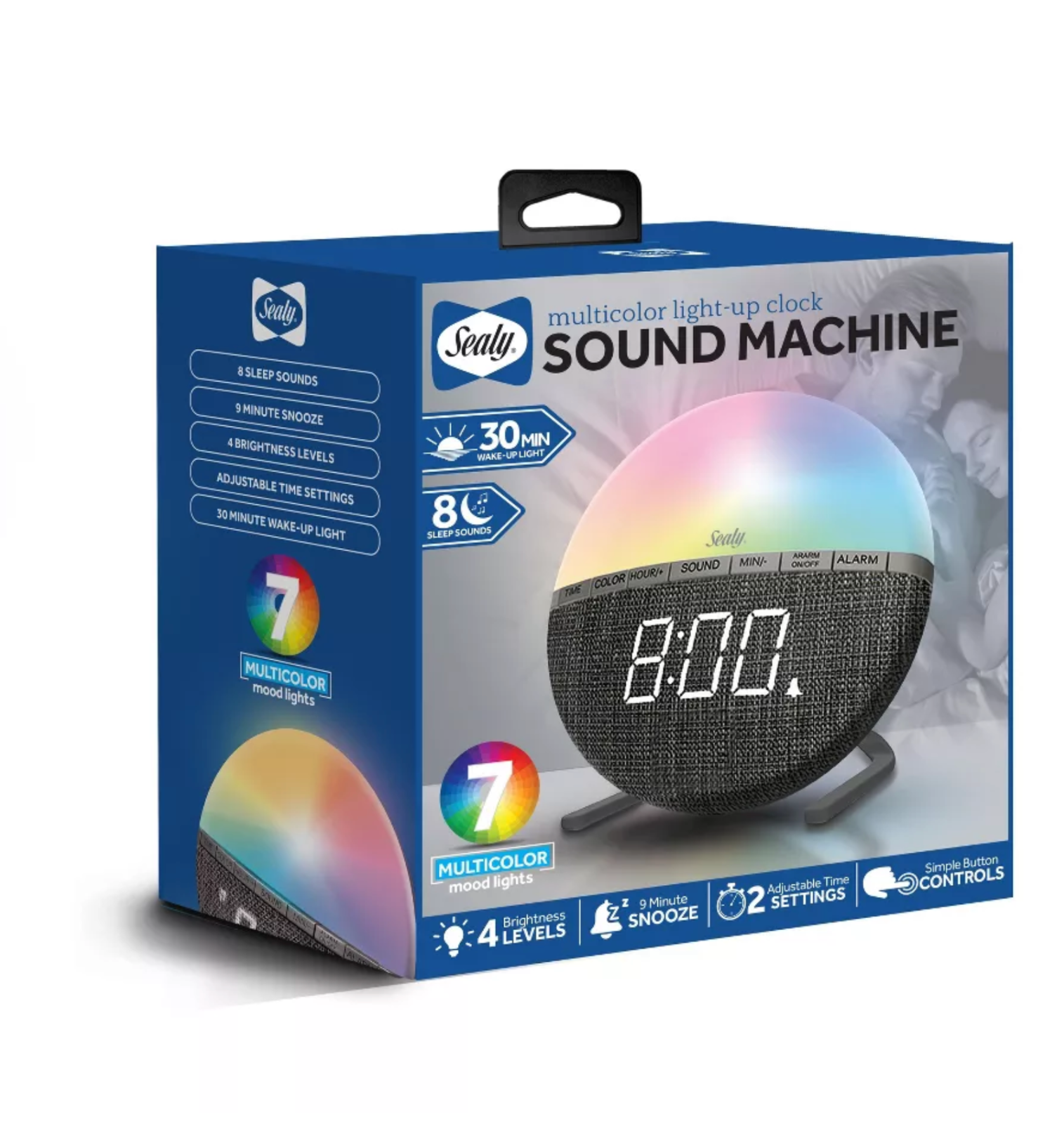 The Sealy LED Fabric Wake-Up Clock & Sound Machine is a modern round-shaped clock with LED display and color-changing features. It functions as a wake-up clock and sound machine, with nature sounds and night light capabilities. The clock has a digital number display and is powered by electricity. The fabric-covered clock is designed for use in any room and has a plastic frame.