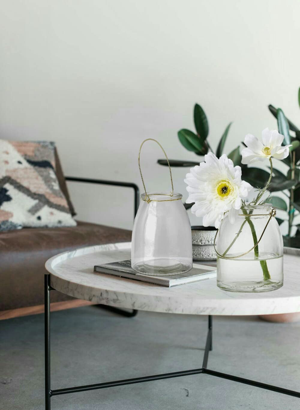 RUSTIC JARS - This simple and elegant glass jar is wider at the bottom and tapers towards the rim METAL HANDLE - An easy to hang gold wire handle adds a touch of class to this outdoor patio hanging lamp. Note: These products are handmade, hence spots and indentations are normal. VERSATILE MASON JAR - Fill it with dried flowers or a mix of wildflowers for a vibrant floral display CREATE AN AMBIENCE - Add fairy firefly string lights or a pillar candle for soft lighting at a porch/ patio/ yard CONVENIENT SIZE - Sold as a set of 12, the vintage style glass vase measures 6" Tall and 5" Diameter
