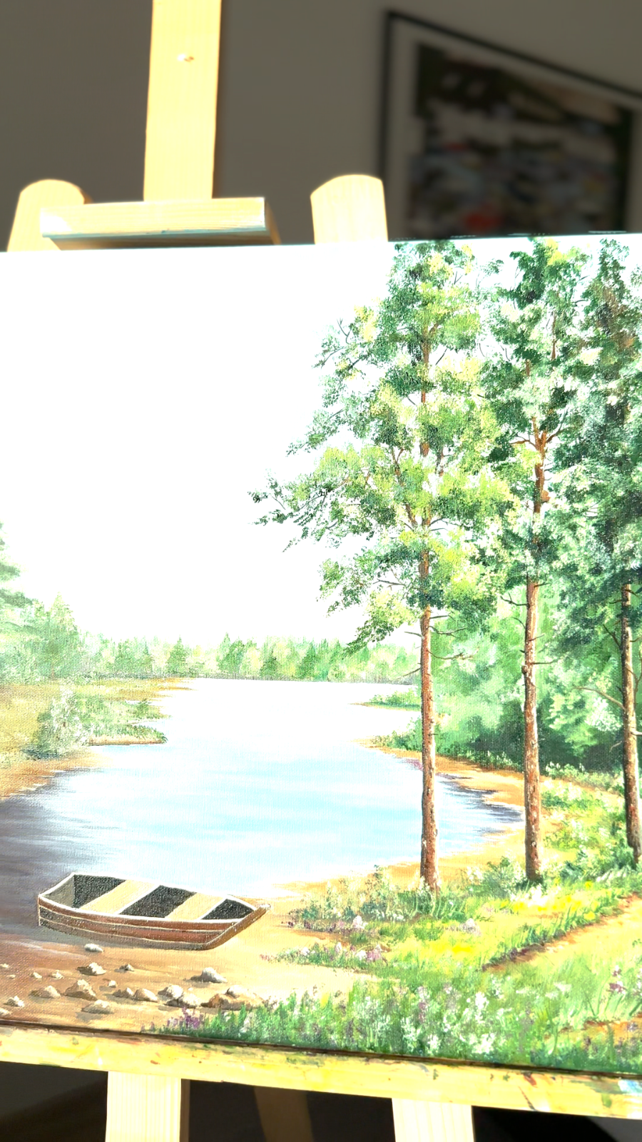 This serene landscape painting captures the peaceful beauty of a quiet riverside. A wooden boat rests on the sandy shore, surrounded by lush green trees and soft grasses, under a bright blue sky with fluffy white clouds. Perfect for adding a sense of calm and natural beauty to any space, this artwork invites viewers to pause and appreciate the tranquility of nature's embrace.
