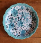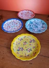 Set of 4 Pioneer Woman Colorful Floral Melamine Appetizer/Salad Plates 6 1/2" Melamine Dessert/Appetizer/Cake plates Scalloped edges In very good pre-owned condition Blue plate has a white blemish on its outer edge (see pictures) Thanks for looking Reach out with any questions you might have Lot 53