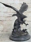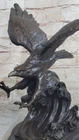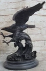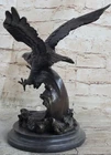 Signed Large Milo Eagle Falcon Art Deco Genuine Bronze Sculpture Figure Deal Signed Large Milo Eagle Falcon Art Deco Genuine Bronze Sculpture Figure Deal Condition : This sculpture is in perfect condition. Bronze Dimensions with Marble Base: Height 12 " X Width 10" Marble Dimensions: Diameter 8" Height without base: 11" Weight: 15 LBS Inventory: 68DW0795486 Introducing a captivating bronze sculpture depicting a majestic eagle in the midst of its hunt. With wings outstretched and talons poised for action, the eagle descends upon the ocean's surface, ready to snatch its prey. The sculpture beautifully captures the intensity and focus of this remarkable bird of prey. The keen eyesight of the eagle is a notable characteristic, allowing it to spot potential prey from great distances. This sculpture highlights the eagle's piercing gaze, with carefully crafted eyes that exude a sense of determination and power. The intricate details of the feathers and the dynamic pose of the eagle showcase the artist's skill and attention to capturing the essence of this magnificent creature. Crafted using the ancient "Lost Wax Method," this bronze sculpture exemplifies exceptional quality and durability. The brown patina finish adds depth and richness to the artwork, accentuating its lifelike features. Signed by the esteemed artist Milo, this sculpture is a testament to his talent and expertise. Whether displayed in a home, office, or as part of an art collection, this eagle sculpture is sure to command attention and evoke a sense of awe. It is a timeless symbol of strength, freedom, and the power of nature. Shipping Terms : Most of our items are shipped via USPS (United States Postal Service) mail or UPS. Most orders are shipped within 24-48 hours of purchase. Please be aware that not all items are available for USPS shipping due to size and weight. We do ship to Hawaii, Alaska, Canada, Puerto Rico, APO/AE, and U.S. Virgin Islands, however, an additional charge may be required. Please contact us before making any purchases in these areas. For Non-USA customers, you may be responsible for all duty, tax, brokerage fees that may be due upon delivery (shipping costs cover freight charges only). We also ship internationally. Please refer to the "Shipping and Handling" chart for the rates for each area. Payment : We accept just about any form of payment. PayPal, Master Card, Visa or American Express credit cards. Money orders, cashiers checks, and even personal or business checks. For governmental institutions, we will also accept a purchase order. Please understand that for personal or business checks we have to wait for the check to clear (usually 7 days) before shipping. Condition : New Detailed Hand Crafted Hot Cast Bronze Satisfaction Guaranteed. This is Stock Photo, Slight Color Variation!! Listing and template services provided by inkFrog