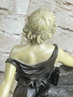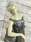 Condition : This sculpture is in perfect condition. Bronze Dimensions with Marble Base: Height 12.5" X Width 6" Marble Dimensions: Diameter 6" Height without base:11.5" Weight:9 LBS Inventory:63XQ06636 This striking sculpture portrays a captivating woman standing gracefully beside a unique and intriguing tree. She is adorned in a stunning gown that drapes elegantly over her figure, with one shoulder exposed for a touch of allure. Her gaze is turned towards her left side, as if lost in deep contemplation, adding an air of mystery to her demeanor. The woman's hair is meticulously styled, with soft curls cascading under a delicate headband, framing her face with effortless sophistication. The intricate details of her attire and hairdo are expertly captured, showcasing the skill and artistry of the sculptor. Crafted with precision using the ancient Lost-Wax Method, this sculpture boasts exceptional quality and craftsmanship. Mounted on a striking black and fire red marble base, it commands attention and makes a bold statement in any space. Signed by the artist Preiss, this piece is a testament to the beauty and timeless elegance of the female form, destined to be admired and cherished for generations to come. Additionally, the hand and arms of the sculpture are crafted from resin, enhancing its durability and lifelike appearance. 13" Western art deco bronze Roman god of wine and plants Girl Bacchus sculpture Video will open in a new window Using the eBay App? Paste link into a browser window: [isdntekvideo]
