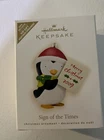 This adorable Christmas ornament features a cute penguin holding a sign that reads "Signs of the Times" from 2009. The ornament is made of durable plastic and is an original licensed reproduction from the Hallmark brand. It's perfect for any collector or fan of animals and holiday decorations. The ornament comes with a set that includes one item and is signed by the artist. Add this unique piece to your collection today! Box with minimal wear