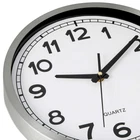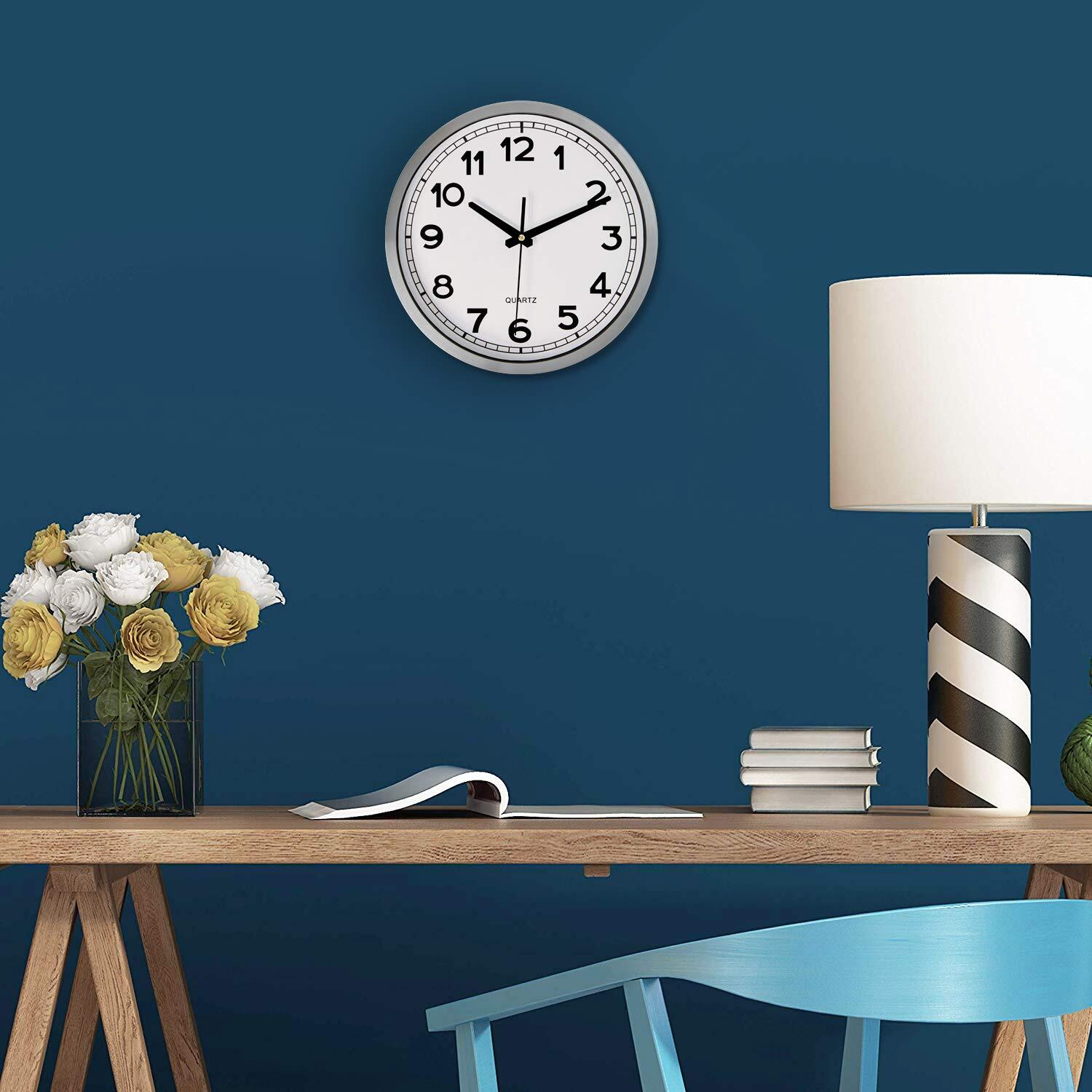 12 Inch round Metal Clock. Large black bold numbers against white face creates easy viewing from any angle. Precise quartz movements accurate time Silent non-ticking mechanism with sweeping movement. Enjoy sleeping and working in a quiet environment! Sturdy silver brushed aluminum metal frame and glass lens make it easy to clean and keeps dust away from dial. Classic timeless timepiece The perfect wall clock for an office, classroom, meeting room, bedroom, kitchen, family room, dining room, bathroom and any room in your home or business Lightweight Easy To Hang. Uses 1 "AA" battery - not included (Note: Plus side of your battery should be inserted first) 1-year manufacture