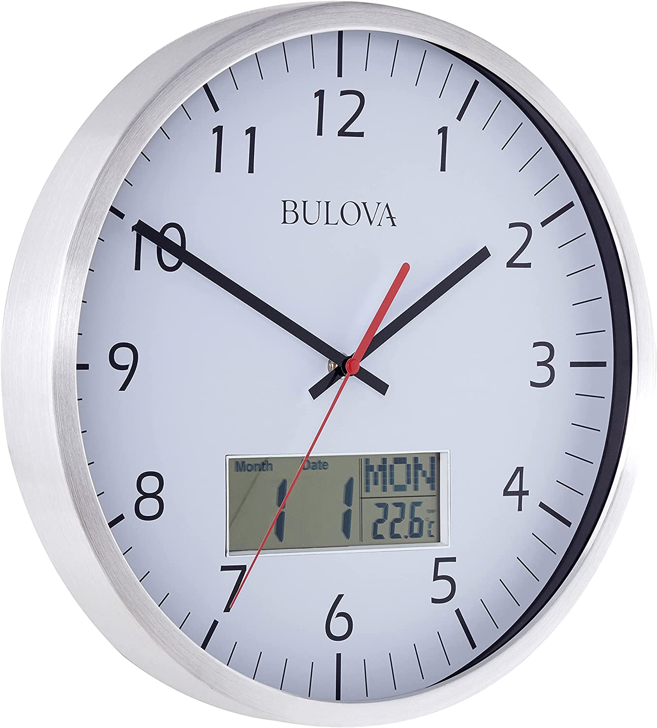 Wall Clock Battery Powered Silver NEW Wall clock with industrial look, featuring clean, brushed aluminum case, glass lens, and silent quartz movement with a red quiet sweep (no ticking) second hand. Bright white dial and bold numerals allow easy reading from a distance, while the digital feature displays month/date/day, and Fahrenheit or Celsius room temperature readouts. Requires (3) AA batteries, not included. MORE BENEFITS Silent quartz movement with a read quiet sweep (no ticking) second handle Bright white dial and bold numerals Digital feature displays month/date/day, and fahrenheit or celsius room temperature readouts Operates on (3) aa batteries, not included One (1) year limited manufacturers warranty.Power source type: Solar Powered SHIPPING We offer FREE shipping on all orders! We ship within 3 business days of payment, usually sooner We use a selection of shipping services such as UPS, FedEx, USPS etc We only ship to the lower 48 states, no APO/FPO addresses or PO Boxes allowed PAYMENT We accept payment by PayPal only - Can accept all kind of credit cards Before buying, please make sure your PayPal and eBay address is correct. If not, please correct it before payment. We have confidence in our products, but if you are not fully satisfied please contact us within 30 days of purchase and you will get full refund. Return the product in the same condition you received it. Please note - return shipping will be paid by the buyer. CUSTOMER SERVICE We try our best to make sure every customer is completely satisfied. If there's a problem, feel free to message us! We're happy to help.