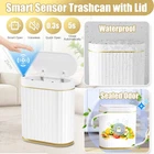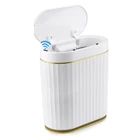 AUTOMATIC OPEN AND CLOSE LID - Our trash can uses Smart Infrared Sensor Technology, the lid will automatically and quietly open within 0.3 seconds through a wave of the hand for a hands-free way to throw away the garbage. And close it after staying for 5 seconds. ELEGANT & SPACE-SAVING - Our trash can combines a modern oval-shaped design with novel wave stripes and white & gold simple elegant color, giving it a good decorative effect on your house. And the compact and slim size makes it ideal for small spaces like a Bathroom, Dresser. SEALING & WATER-RESISTANT DESIGN - Advanced IPX5 waterproof technology prevents water or humid environment from damaging the unit. And touchless smart lid has good sealing that helps keep garbage out of sight and hides odors. DURABLE & EASY TO CLEAN - Made of ABS engineering plastics and treated with polished. Sturdy and easily remove the dirt on the surface of the trash can with just 1 touch. Ideal for use in the Office, Kitchen, Bathroom, Bedroom Room Desk/Floor, etc. SMALL CAPACITY & LARGE OPENINGS - 7L Size: 10.24x5.51x11.42inches , great for put it on the floor; 5L Size: 10.24x5.51x7.87inches, great for put it on the table. Height of lid open: 4.61inches, Caliber size: 8.66x3.82inches, Powered by 2 AA batteries(not included).
