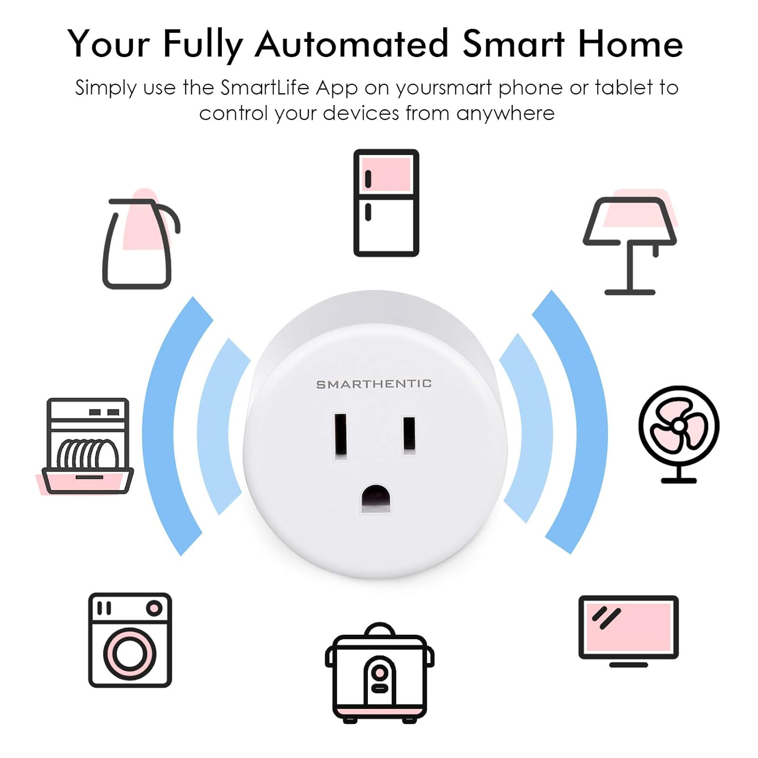 VOICE COMMAND TO CONTROL: Smarthentic smart plugs that work with Alexa and Google Home Assistant. Just give a simple voice command to control your home device with a smart outlet via Alexa or Google Home Assistant. No hub is required to install the wifi plug. Smarthentic Alexa outlet plug works with a stable 2.4GHz network. SCHEDULE & TIMER: By setting schedules and timers for your home smart wifi electrical plugs, you can prepare a crockpot meal and get home with dinner ready. Get ready to have a smart home and create a customized schedule to automatically turn on/off any home electronic appliances such as lamps, Christmas lights, coffee makers, etc. Please note that the Alexa outlet plug is not suitable for appliances whose power is more than 10A,1200W (eg: air conditioner, microwave oven, induction cooker, etc.) REMOTE CONTROL FROM ANYWHERE: Smarthentic google smart plug can help you control your home appliances from anywhere. Even you are not at home, you also can control your Alexa wifi outlet via Smarthentic App directly, as long as your phone access a secure 2.4 GHz Wi-Fi network. Ideal for someone who cannot move around very well and needs easy access to turn on/off a device CREATE GROUP AND SHARE TO FAMILIES: Set a group for all google home outlets and control them in one command. Share your wifi plugs that work with Alexa with all family members in a minute. No more worries, everyone can control them easily EASY TO INSTALL AND SAFE: Just plug a device into the mini wifi smart outlet and connect to your secured 2.4GHz network with the "Innova Life" App. ETL certification ensures complete protection. Smarthentic smart plug is backed by lifetime unconditional service. Product Description Smart Plug for Home Appliances Connect to your smartphone Working Temp: -10 ~ 60℃ Wi-Fi Requirement: 2.4GHz Rated Voltage: 120V Rated Current: 10A Max AC Frequency: 50-60 Hz Max power: 1200W The maximum power changed as local voltage Support smart phone IOS 8.0 above, Android 4.4 above. The smart plug can only support 2.4G network when connecting Smarthentic Mini Smart Plug ETL Listed makes it more trustworthy If you want to enjoy easier life and home automation, come on, join in Smarthentic Brand, we have smart plug, smart switch, smart power strip, smart bulb, and smart led strip lights, in here, you will experience a different way to life. With the Smarthentic smart WIFI plug let you can manage fans, lamps, and other small electronics up to 10 AMPs, from anywhere with the "Tuya Smart" App. Even use simple voice commands with Alexa, Google Home Assistant conveniently from your smart phone. Functions of Smarthentic smart plug Works with Amazon Alexa Compatible with Google Assistant Schedule Timer function Create Group Share to your family Create Smart Scenario Smarthentic Mini Smart Plug Main Functions Schedule Timer Function You can use the "Tuya Smart" app to create schedules / timer to automatically power on/off your appliances. Work with Amazon Alexa, Google Assistant You can use voice to control your smart devices with Alexa or Google Home Assistant. For example, say “Alexa, turn on the light”. Wireless Control from Anywhere With Smarthentic smart plug, you can create scene modes, scheduling your home devices on/off at sunrise/sunset automatically before you leave home or back to home. Add your light to Scene Schedule List, It can be turned on automatically when the some body is home. Running your house smarter and effectively. Create Smart Scenario Set customized scenes for multiple devices before you back home. Scan the QR code to connect Innova life APP to connect To connect smart plugs and Wifi, please scan the QR code, install the APP Follow the steps to set up Then you are connected Be aware, there might be a communication issue with Alexa Skill, If so, please try the other 2 APPs on the right side. Smart life APP to connect To connect remote control plugs and Wifi, please scan the QR code, install the APP Follow the steps to set up Then you are connected Tuya Smart APP to connect To connect your mini smart timer plugs and Wifi, please scan the QR code, install the APP Follow the steps to set up Then you are connected