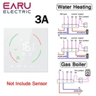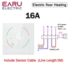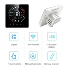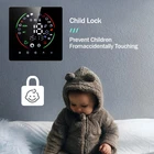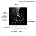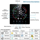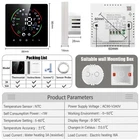 Application Intelligent digital thermostatIt is a floor heating system suitable for room temperature control and household temperature control,Control the operating status of underfloor heating equipment by sensing the comparison between ambient temperature and set temperature.Improve comfort while achieving energy-saving goals,Digital thermostat,It adopts microcomputer control technology and displays touch buttons in full screen. The design is elegant, generous, and easy to use. The temperature controller has manual and automatic functions, programmable functions, status memory functions, child lock functions, and can obtain weather and humidity with WIFI. Electrical specifications 1. Temperature sensor: NTC 2. Temperature accuracy: ± 1 ℃ 3. Display LED 4. Working environment -5~50 ℃ 5. Self consumption power<1W 6. Temperature setting: 5-60 ℃ 7. Display range: 0-50 ℃ 8. Load current: Water heating 3a (resistive) Electric heating 16A 9. Power supply voltage: AC90-240V Packing List 1*Thermostat 1*Sensor probe(only 16A electric floor heating include sensor cable) 2*Screws 1*Manual