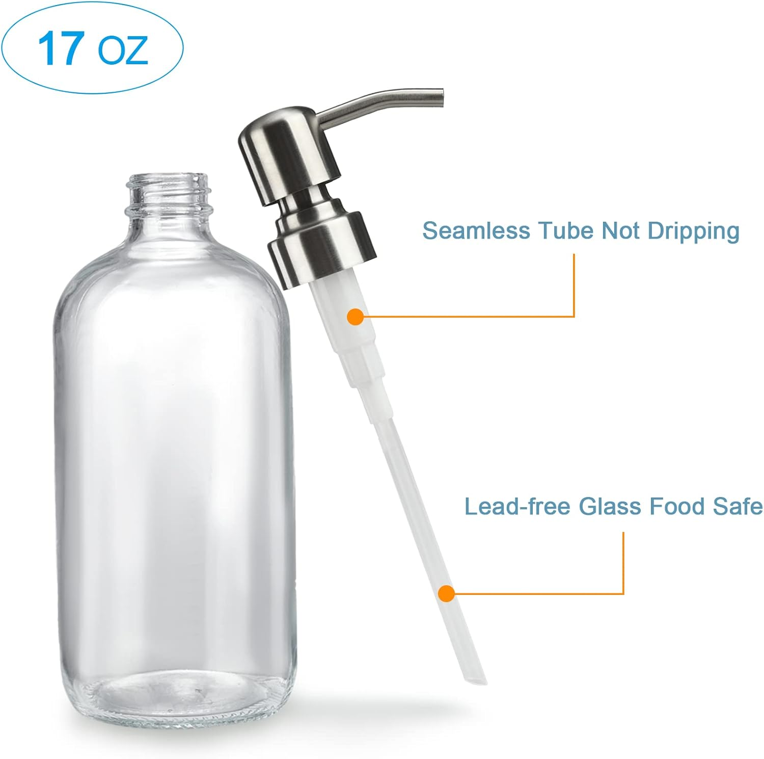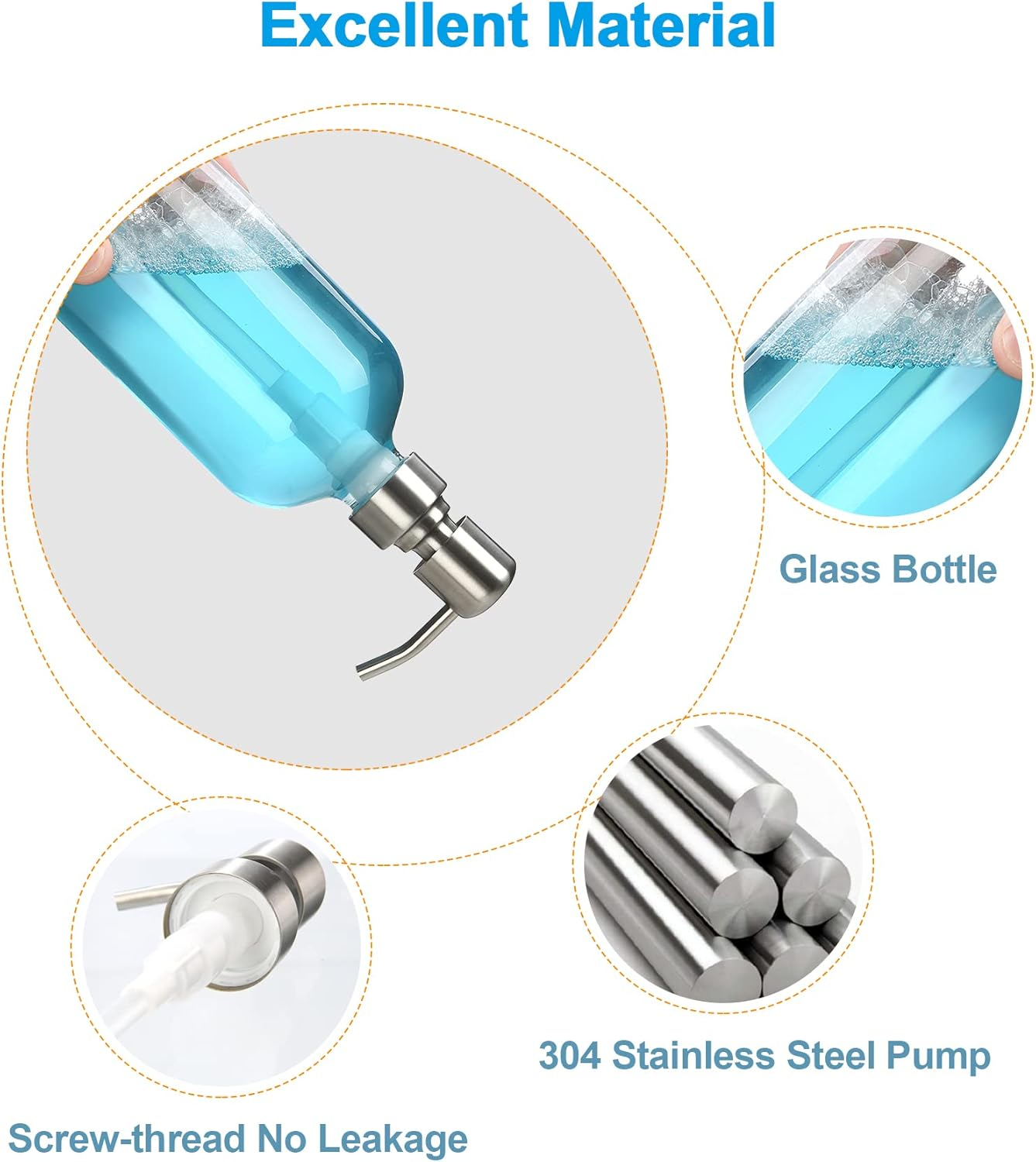 Lead-free thick bottle: Set of 2 thick soap dispensers are made of lead-free glass & pump, which can be safely used as dish soap dispenser for kitchen or hand soap dispenser for bathroom. Elegant bathroom soap dispenser décor: Boston Round bottle glass hand soap dispenser, simple and elegant design humble yet beautiful accessory of your bathroom and practical soap dispenser kitchen. Soap dispenser 17oz : The soap in the clear soap dispenser can be clearly seen the consumption which remind you to replenish. Dish soap dispenser size: 8.5"x3". Glass soap dispenser volume: 17oz. Glass soap dispenser with pump: Amazerbath hand soap dispenser with improved stainless steel pump effectively avoid corrosion and rust, deliver liquid smoothly every press without dripping. Pearl cotton wrap: Each bathroom soap dispenser set is wrapped tightly by pearl cotton to prevent the glass soap dispenser from breaking during transit. Please be carefully when pull out the hand soap dispenser. Product Description 1 Bathroom 2 Kitchen The video showcases the product in use. The video guides you through product setup. The video compares multiple products. The video shows the product being unpacked. Multi-color for your choice Add to Cart Add to Cart Add to Cart Add to Cart Add to Cart Add to Cart Add to Cart Customer Reviews 4.6 out of 5 stars 6,173 4.6 out of 5 stars 6,173 4.6 out of 5 stars 6,173 4.6 out of 5 stars 6,173 4.6 out of 5 stars 6,173 4.6 out of 5 stars 6,173 4.6 out of 5 stars 6,173 Price $14.85 $ 14 . 85 $17.99 $ 17 . 99 $16.99 $ 16 . 99 $15.99 $ 15 . 99 $15.53 $ 15 . 53 $14.99 $ 14 . 99 $15.53 $ 15 . 53 Features Practical Beautiful Decoration Beautiful Decoration Multipurpose High Quality Lead-free Lead-free Material Glass Glass Glass Glass Glass Glass Glass Bottle color Clear Clear Amber Clear Clear Amber Amber Pump color Chrome Gold Gold Black Bronze Black Bronze Quantity 2 2 2 2 2 2 2 Capacity 17 oz 17 oz 17 oz 17 oz 17 oz 17 oz 17 oz Pump material Stainless steel & plastic Stainless steel & plastic Stainless steel & plastic Stainless steel & plastic Stainless steel & plastic Stainless steel & plastic Stainless steel & plastic
