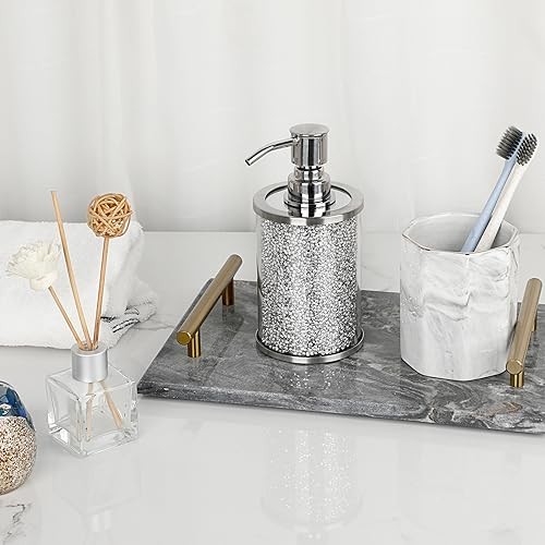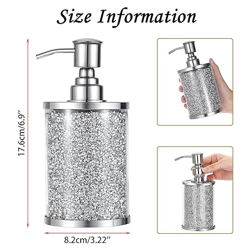 Return Policy Fast Delivery Trusted seller Soap Dispenser Bathroom Sparkling Hand Dispenser with Stainless Pump,Silver Crushed Diamond Dish Soap Dispenser for Kitchen Decorative Soap Dispensers for Kichen Sink Bathroom Countertop Product Description Gorgeous & Bling Decoration - The gorgeous and bling style soap dispenser for kitchen sink can blend in perfectly with most home décor; It can not only match well with your other silver crushed diamonds furniture and accessories, but also add luxury looking and aesthetic touch to your home. ?Premium Quality - The sparkle bathroom soap dispenser is made of borosilicate glass and stainless steel with silver crushed diamonds, it's well crafted by beautiful shape and sparkle look. The stainless steel pump is rust-resistant and the long nozzle design keeps soap from dripping on the bottle and staining it. ?Multi-Purpose: Versatile silver soap dispenser can be widely used to dispense detergent, hand sanitizer, lotion, shampoo and body wash; Perfect for use in kitchen sink, bathroom, washer/dryer room, laundry room, etc. ?Easy to Use & Refill: The pump mechanism of this kitchen soap dispenser works smoothly, so the soap flows out smoothly and easily, just right, without wasting any soap; And it's not only easy to refill, but also its decorative yet clean design also does not add clutter to our space. ?Ideal Gift Choice: Decorative black soap dispenser bathroom will be a perfect gift for you to share with your family and friends, it's really an Ideal Gift for House warming, Wedding, Anniversary, Christmas and New Year!!! Shipping Returns Payment Shipping Shipping is FREE to all addresses other than APO/PO boxes in the lower 48 states. All our stock ships from US-based warehouses. Shipped via USPS or UPS (depending on location and package weight) Unless stated otherwise, all orders will ship within 24-72 hours of your payment being processed. Check our feedback to see the great reviews of FAST shipping we offer. Returns Seller does not accept returns Payment We currently accept payment via eBay managed payments only. Once payment is cleared, we will dispatch your shipment within 1-3 business days. Please refer to the "Shipping" tab for more information regarding shipping speed to your destination.