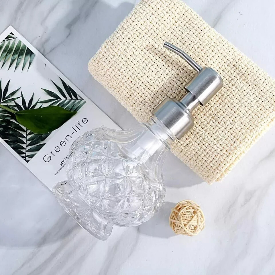 Soap Dispenser with Stainless Steel Pump, Clear Crystal Design, Style 1 This liquid dispenser bottle is made of sturdy glass and durable 304 stainless steel pump. The mechanism is smooth. Stylish, sturdy, and performs as it should. Elegant Accessory: Practical Home Decor. It can be placed in any countertops, bathroom, kitchen, or office. Beautiful accessory of your home, make your house neat, organized and stylish. Cut-Glass Dispenser: Stylish glass soap dispenser with pattern, perfect for soap, lotion, hand soap, dish soap, etc. These dispensers are very pretty, adding stylish and comfort to your life, glamming up your kitchen sink or bathroom counter, making your house stunning. Item Specification Item model number TTJP-71 Unit Count 1 Count Number of Sets 1 Item Weight 8.8 ounces Shape Hand Product Dimensions 3.3"L x 3.3"W x 6.1"H