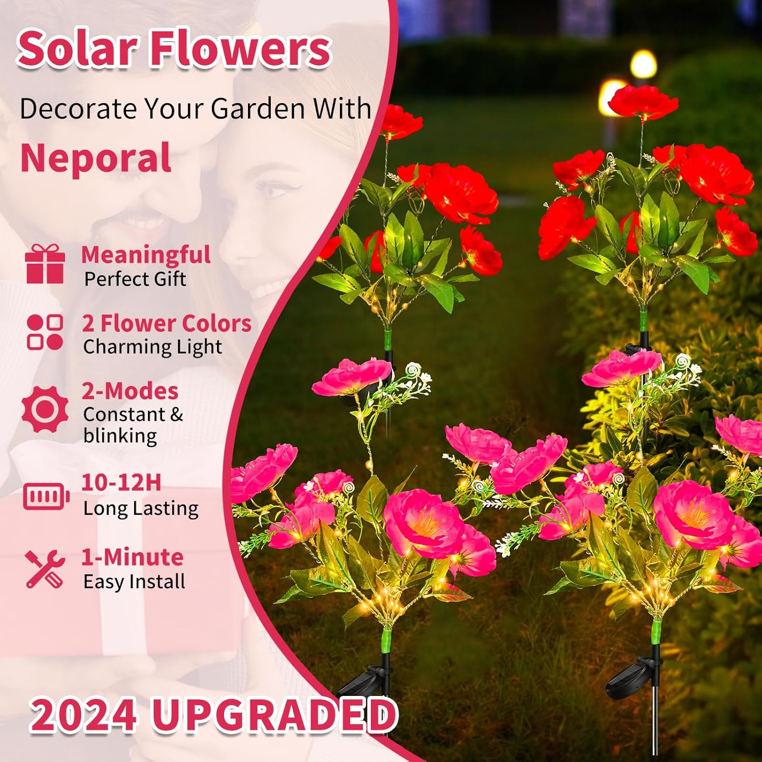 These solar flowers are a gorgeous addition to my garden! They light up beautifully at night with a warm, inviting glow, and the two lighting modes add a nice touch. Super easy to install, waterproof, and the solar charging works perfectly—no wiring needed. Love how they brighten up my yard while saving energy. Highly recommend for anyone wanting cute, low-maintenance outdoor decor!