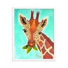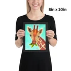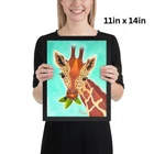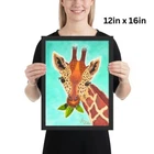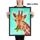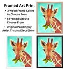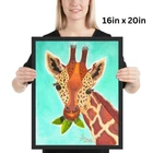 Make a statement in any room with this colorful baby Giraffe eating leaves named Sophie framed poster art print of an original artwork by artist Tristina Dietz Elmes that she painted for her baby grandson. This playful image is printed on thick matte paper mounted in a matte black, white or red oak finish frame of wood from renewable forests. Select your desired frame primary color (black, red oak or white) and size to customize your order. • Ayous wood .75″ (1.9 cm) thick frame from renewable forests • Paper thickness: 10.3 mil (0.26 mm) • Paper weight: 189 g/m² • Lightweight framed art print • Acrylite plastic front protector (no glass!) • Hanging hardware included • Blank product components sourced from Japan and the US • Printed and assembled in the US or UK This product is made especially for you by a professional print company as soon as you place an order, which is why it takes a bit longer to deliver it to you. Creating products on demand instead of making these prints in bulk helps reduce up-front costs and allows me to offer you a superior individualized product, so thank you for your support by making this a thoughtful purchasing decision! There are many more prints, original paintings, collectibles and fun gift items in Tristina's Attic. So, please take a look around and follow the store for easy access to new items added weekly. Happy Shopping! 🛍️