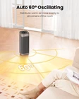 Fast Heating Takes Only 2S: With the help of a powerful 3,600 rpm/min wind speed and 1500W PTC ceramic this space heater quickly sends out hot air, you can clearly feel the change from cold to warm in 2 seconds. With 5 modes, including natural wind, ECO, and 3 modes of hot air (600w/1000w/1500w), the heating temperature range is 41℉ to 95℉ Safe and Reliable: The body of this ceramic heater is made of V0 grade flame retardant material, with multiple safety features, including overheat protection, anti-tip protection, automatic shutdown after 24 hrs no operation, reinforced plug, built-in Double fuses to prevent short circuits, ensuring you have worry-free use ECO Life: Our electric heater can realize intelligent ecological mode, through the built-in precise NTC temperature sensor, It can adjust the heating power according to the ambient temperature and the required temperature you set to help you warm and save energy with maximum efficiency Auto Oscillating & Remote Control: 60° wide oscillating helps distribute warm air more evenly to all corners of the room, quickly heating small to large rooms on cold days, perfect for offices, bedrooms, and living rooms. The multifunctional remote control can be accessed from up to 33 feet away, You can remotely turn the heater on/off, adjust the heater temperature, set a timer, turn oscillation on/off Quiet Working: This electric heater can produce heat quietly. The fan blades and motor are optimized to cut the wind more efficiently and the wind force is stronger. Coupled with the heater body structure that has been tested hundreds of times, it works more quietly. Warmth airflow allows you to sleep peacefully and work undisturbed in the cold winter, you can barely hear a sound